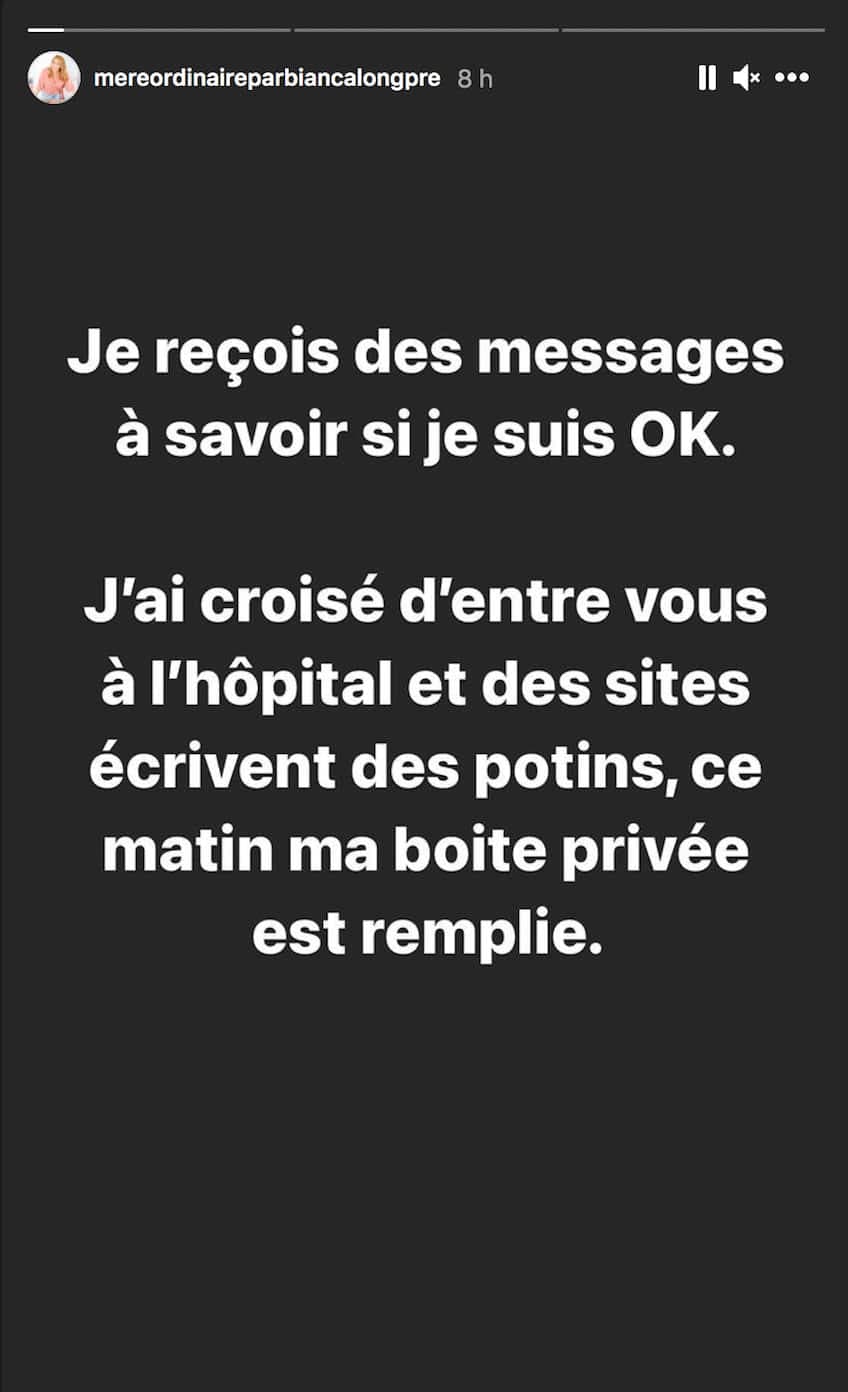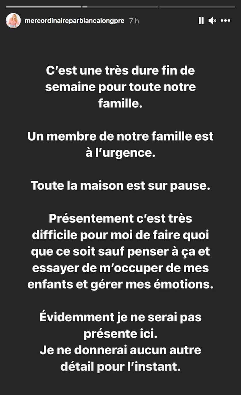 Afin de mettre cartes sur table, Bianca Longpré a expliqué qu'un membre de la famille se trouvait présentement à l'urgence, sans toutefois donner de précision à propos de qui il s'agit.