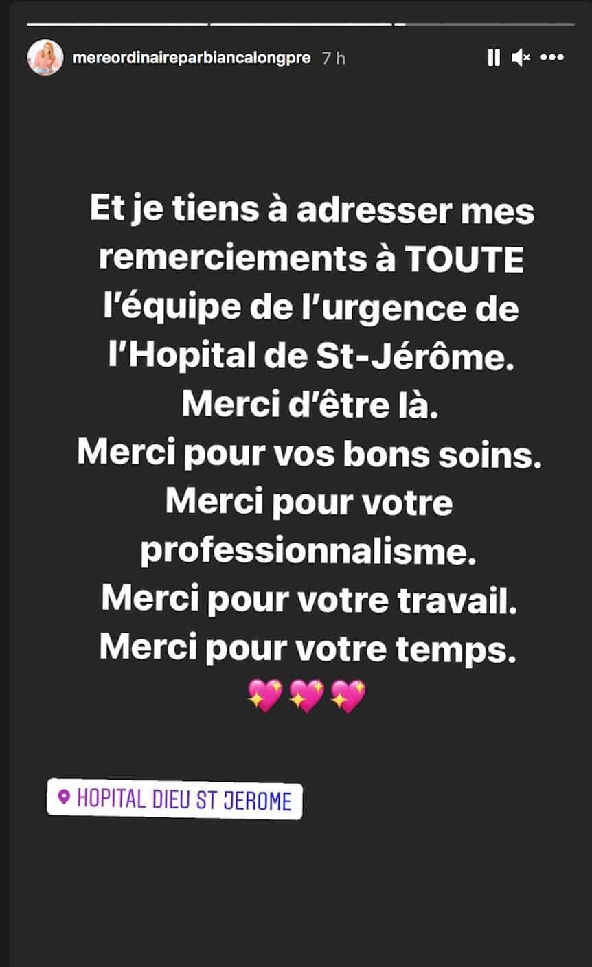 Elle ajoute qu'elle ne sera pas présente sur Instagram pour un moment, tentant tant bien que mal de naviguer à travers tout cela, prenant le soin également de remercier l'équipe de l'urgence de l'hôpital de St-Jérôme.