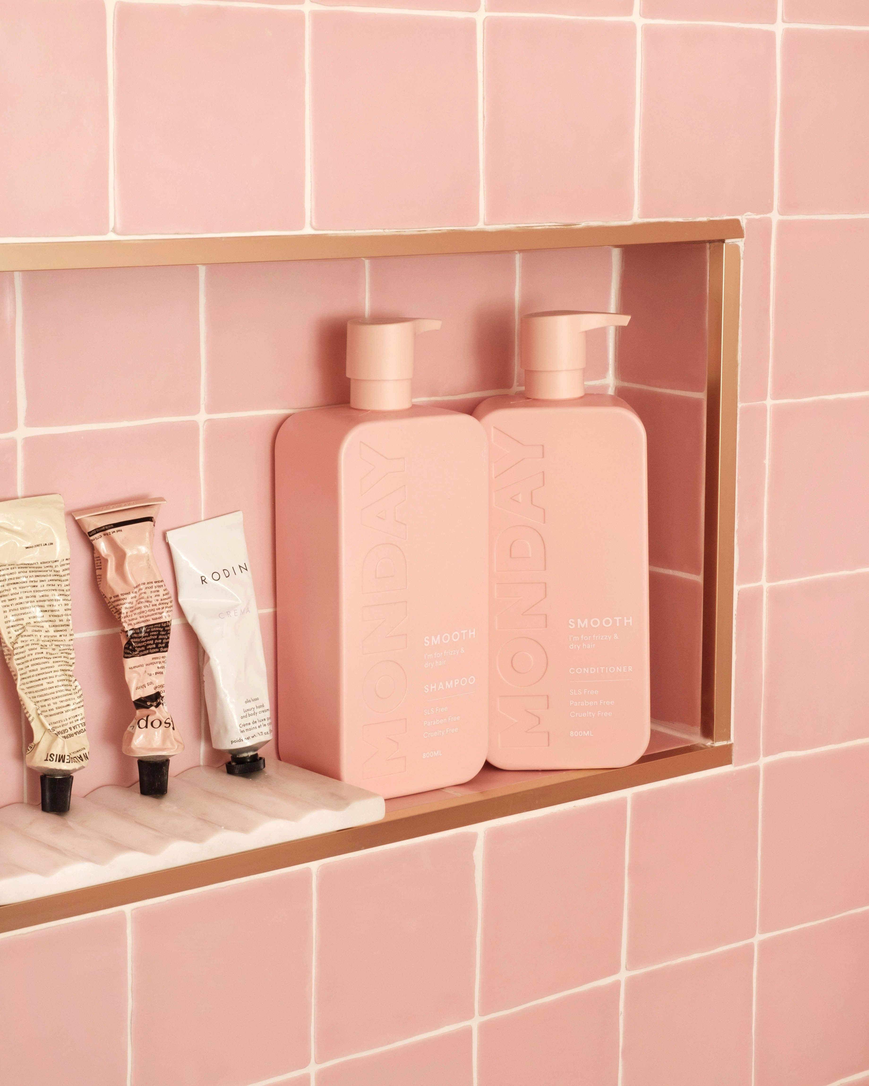 MONDAY Haircare est reconnue pour ses produits abordables de qualité, contenus dans un packaging qui complimente à merveille nos salles de bain! La marque se démarque par ses bouteilles roses uniques et minimalistes qui se placent parfaitement sur une étagère ou dans votre niche de douche.