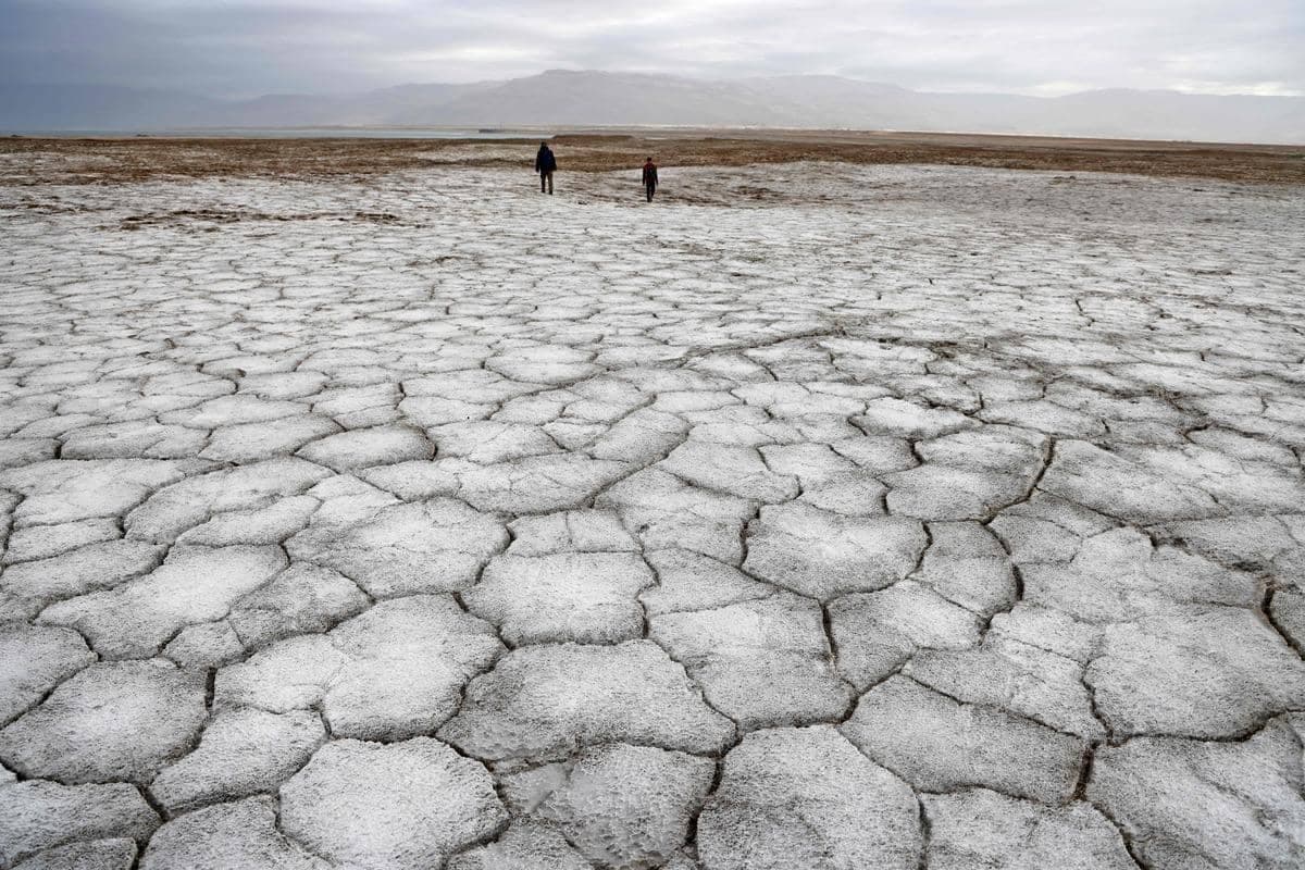 Les eaux bleues se retirent d’environ un mètre chaque année, laissant derrière elles un paysage lunaire, une terre blanchie par le sel et perforée de trous béants.