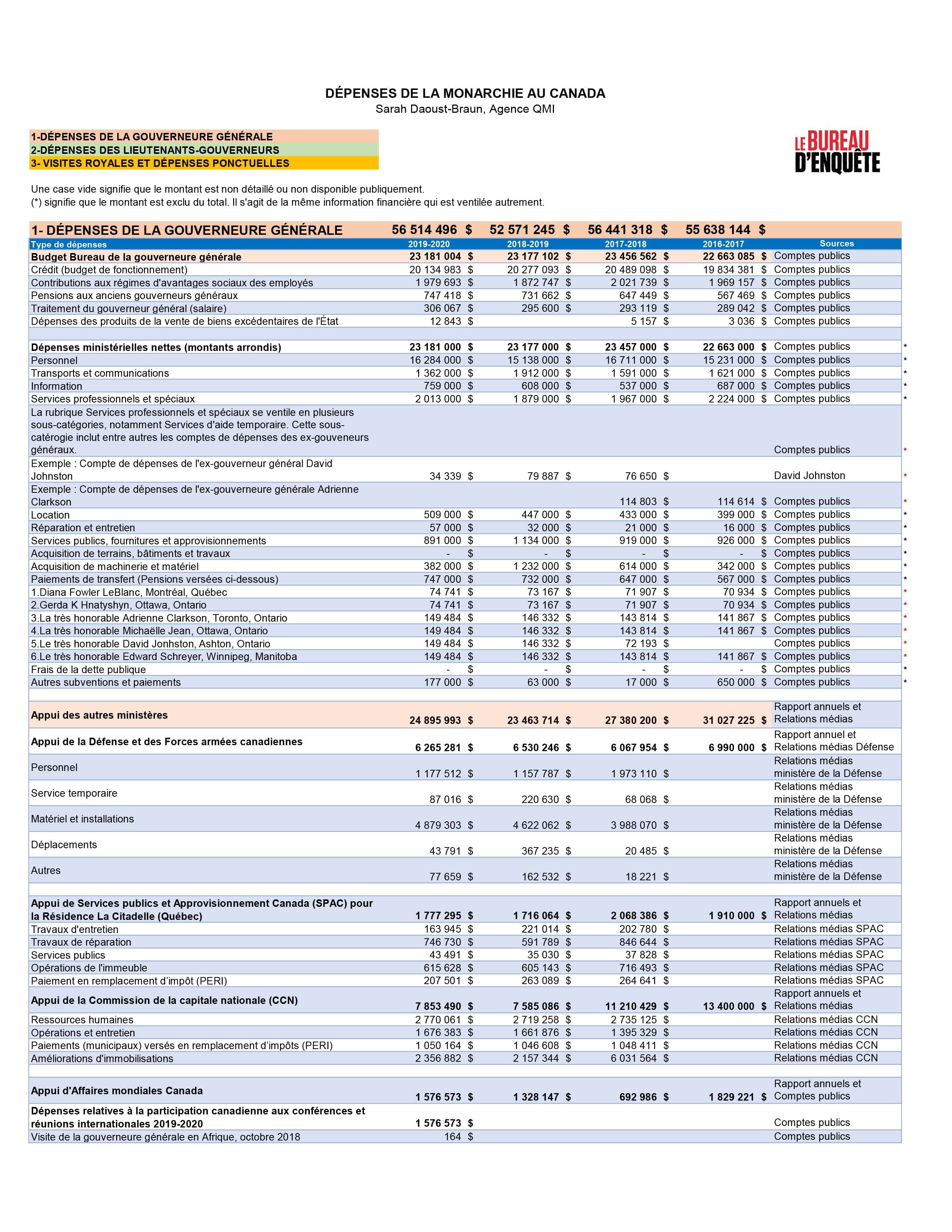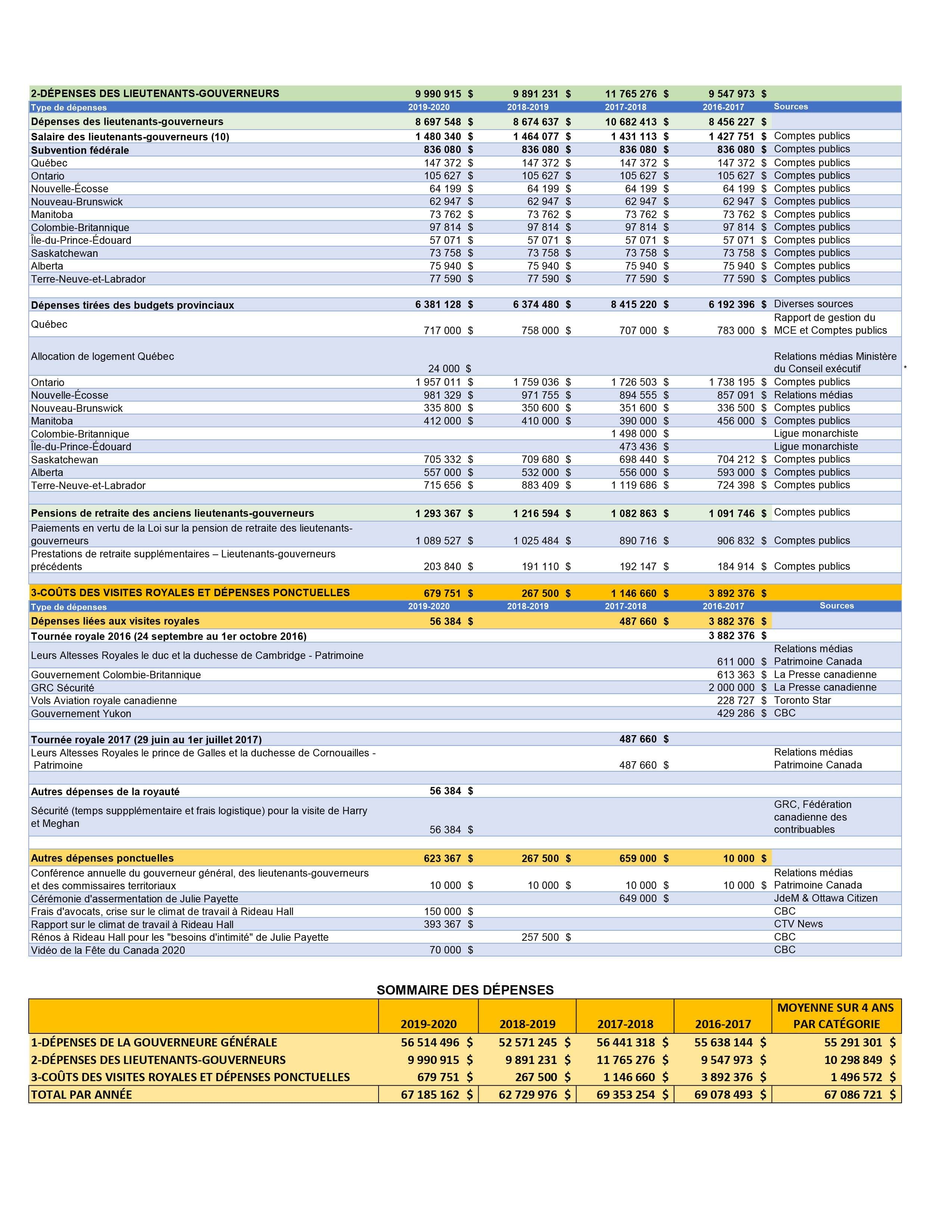 - Dépenses du Cabinet du lieutenant-gouverneur défrayées par Québec : 717 000 $ en 2019-2020