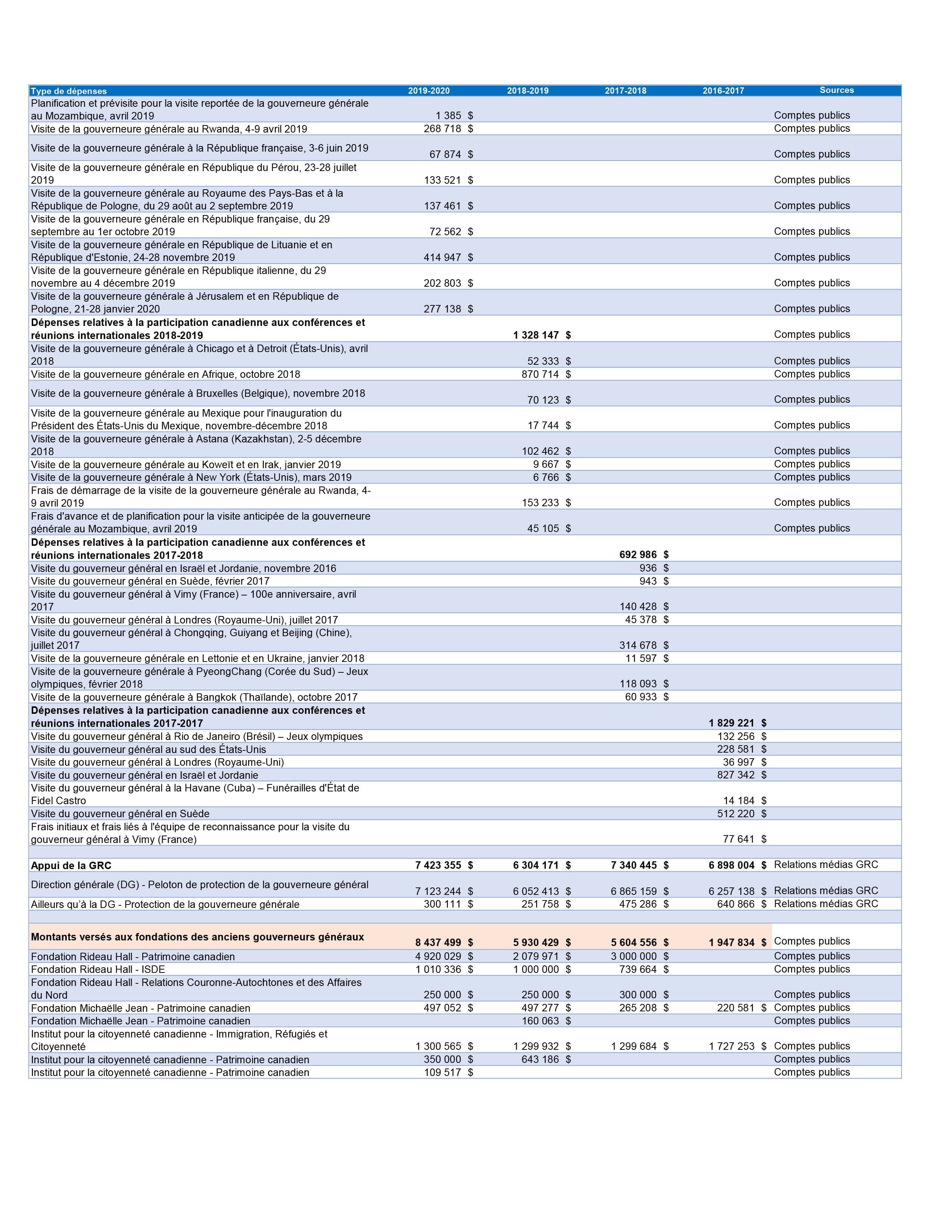 - Aide fédérale à des organismes d’anciens gouverneurs généraux (la Fondation Michaëlle Jean, la Fondation Rideau Hall et l’Institut pour la citoyenneté canadienne) : 8,44 M$ en 2019-2020