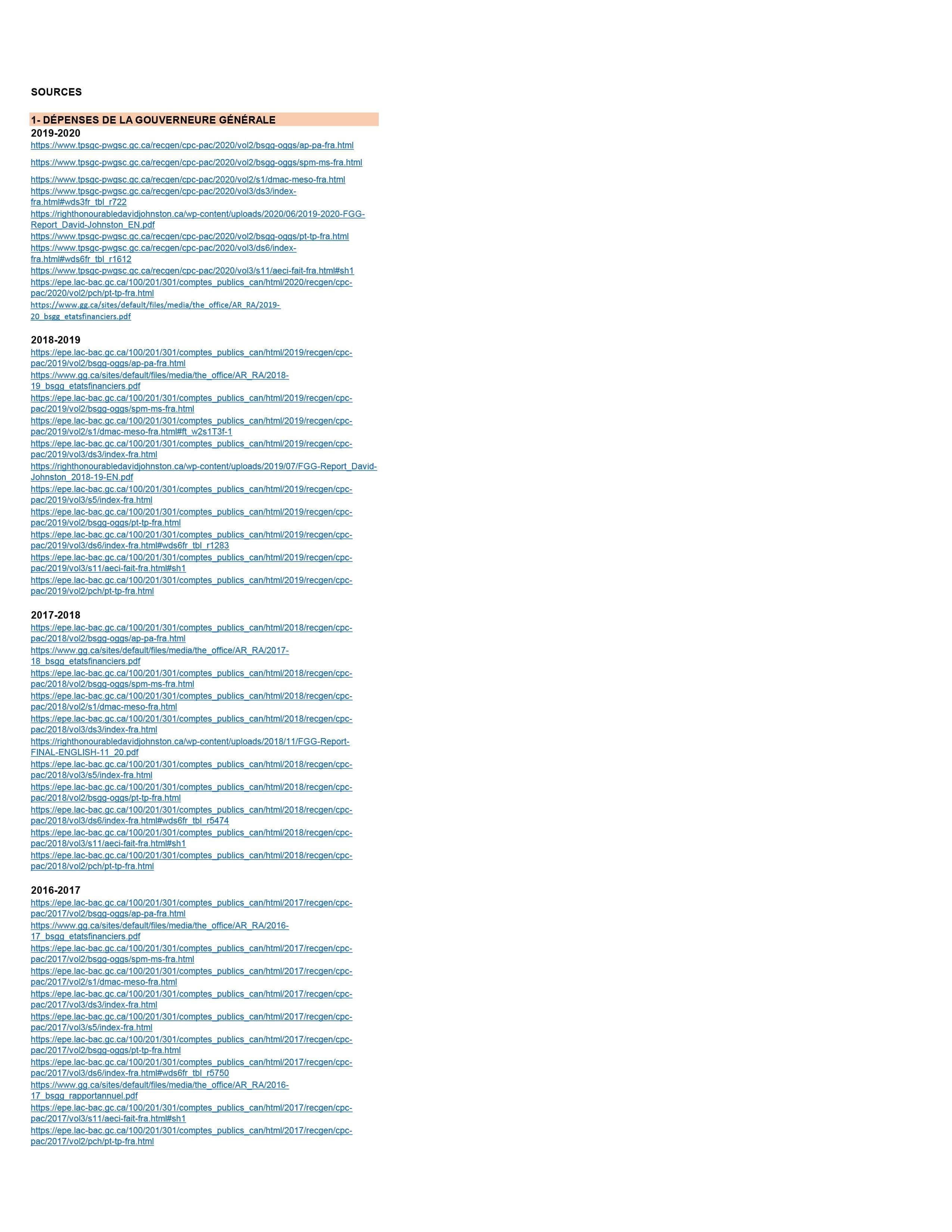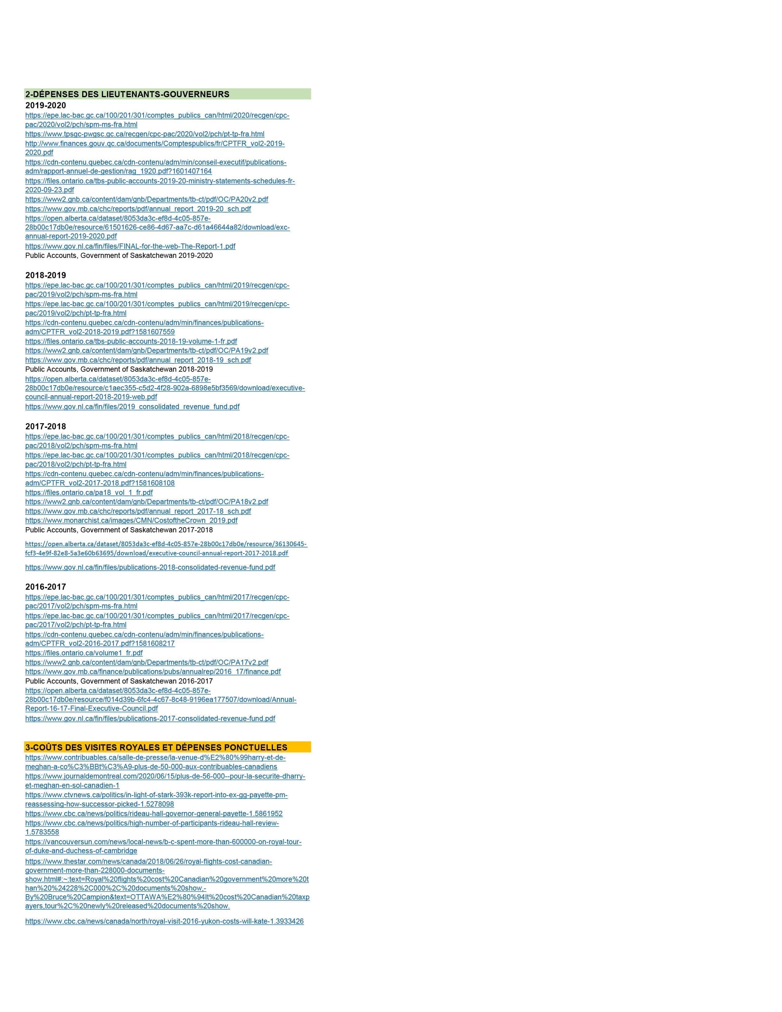 Sources : Comptes publics du Canada, gouvernement du Canada et gouvernements provinciaux, médias (CBC, National Post, Ottawa Citizen, La Presse canadienne, CTV News, Toronto Star), Ligue monarchiste du Canada, Fédération canadienne des contribuables