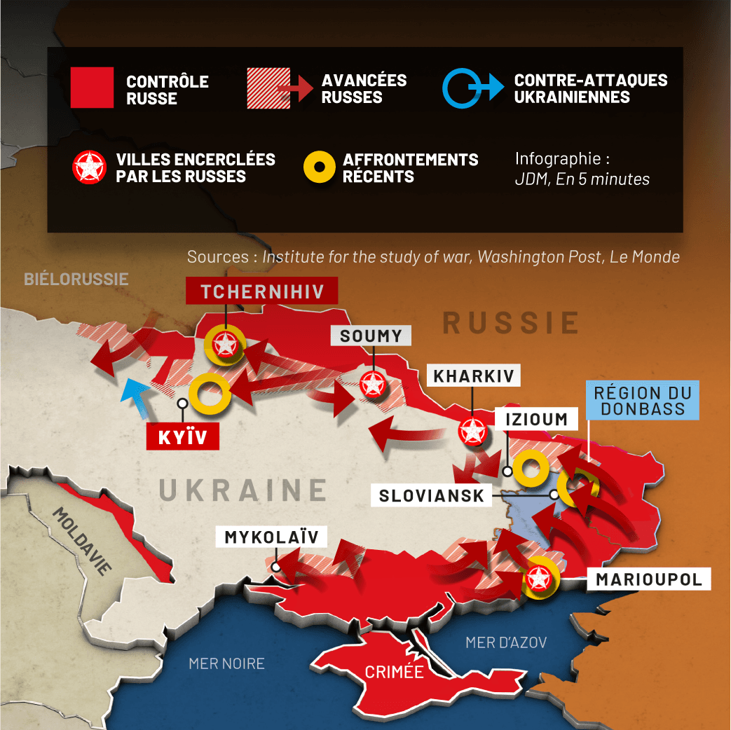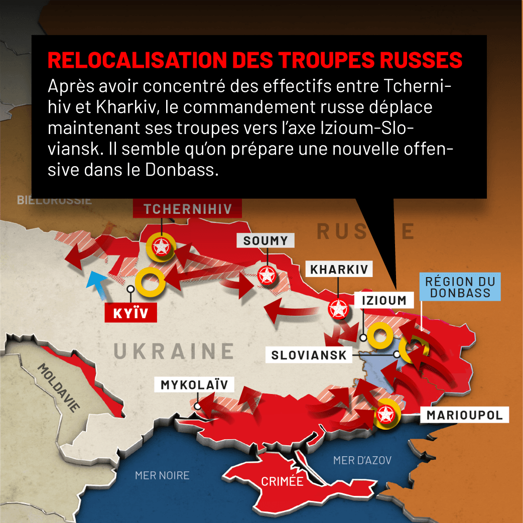 Autant pour Kyïv que pour Tchernihiv, les choses pourraient s’améliorer à court terme puisqu’on note des déplacements de troupes russes vers la Biélorussie ou encore vers l’est de l’Ukraine, là où les effectifs et le matériel doivent être concentrés si on veut mener une offensive victorieuse dans le Donbass.