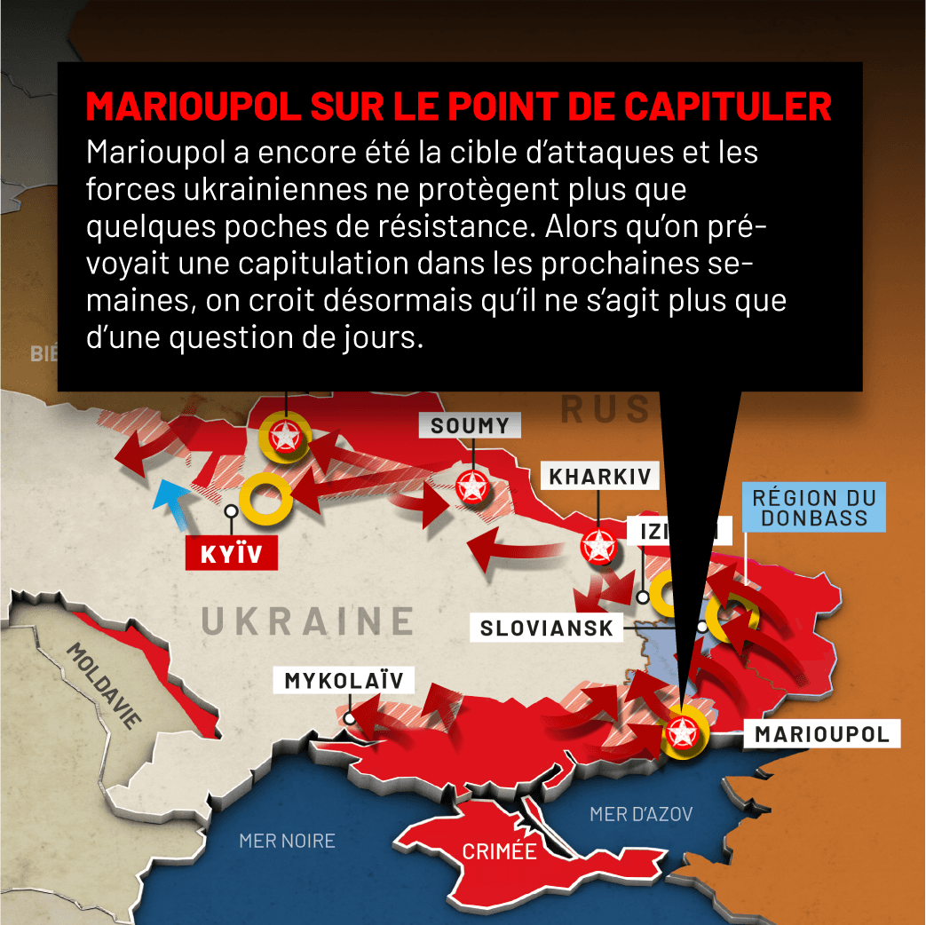 Toujours ennuyé par des difficultés de recrutement et du matériel vétuste, le commandement russe peine à ajuster la stratégie. Si Marioupol tombe dans les prochains jours, on craint un manque de ressources pour s’imposer ailleurs (voir encadrés explicatifs ci-bas).