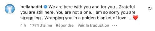 «Nous sommes avec toi, et là pour toi. Je suis reconnaissante que tu sois encore parmi nous. Tu n’es pas seule. Je suis désolée que tu souffres. Je t’enveloppe dans une couverture dorée d’amour», a-t-elle écrit.