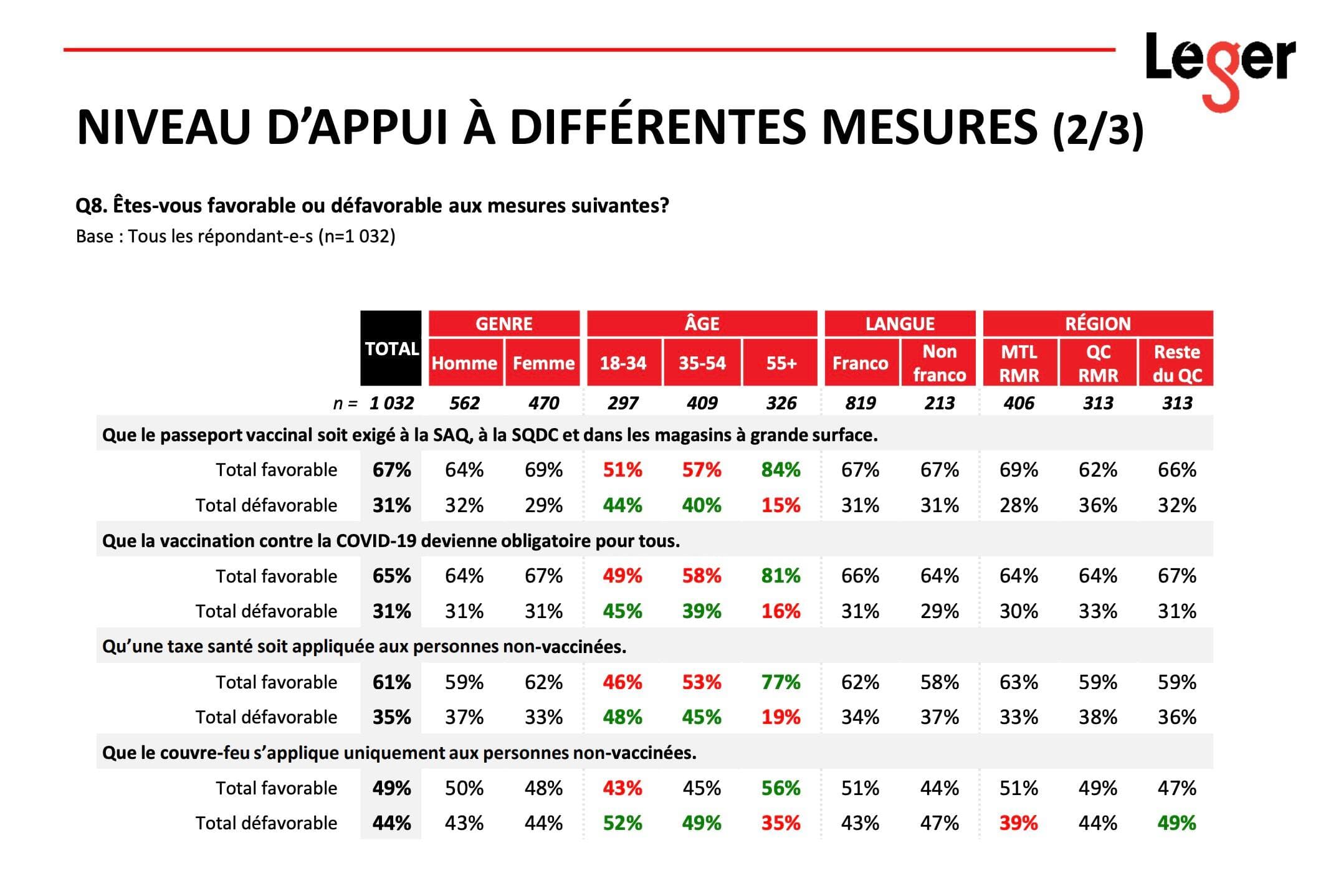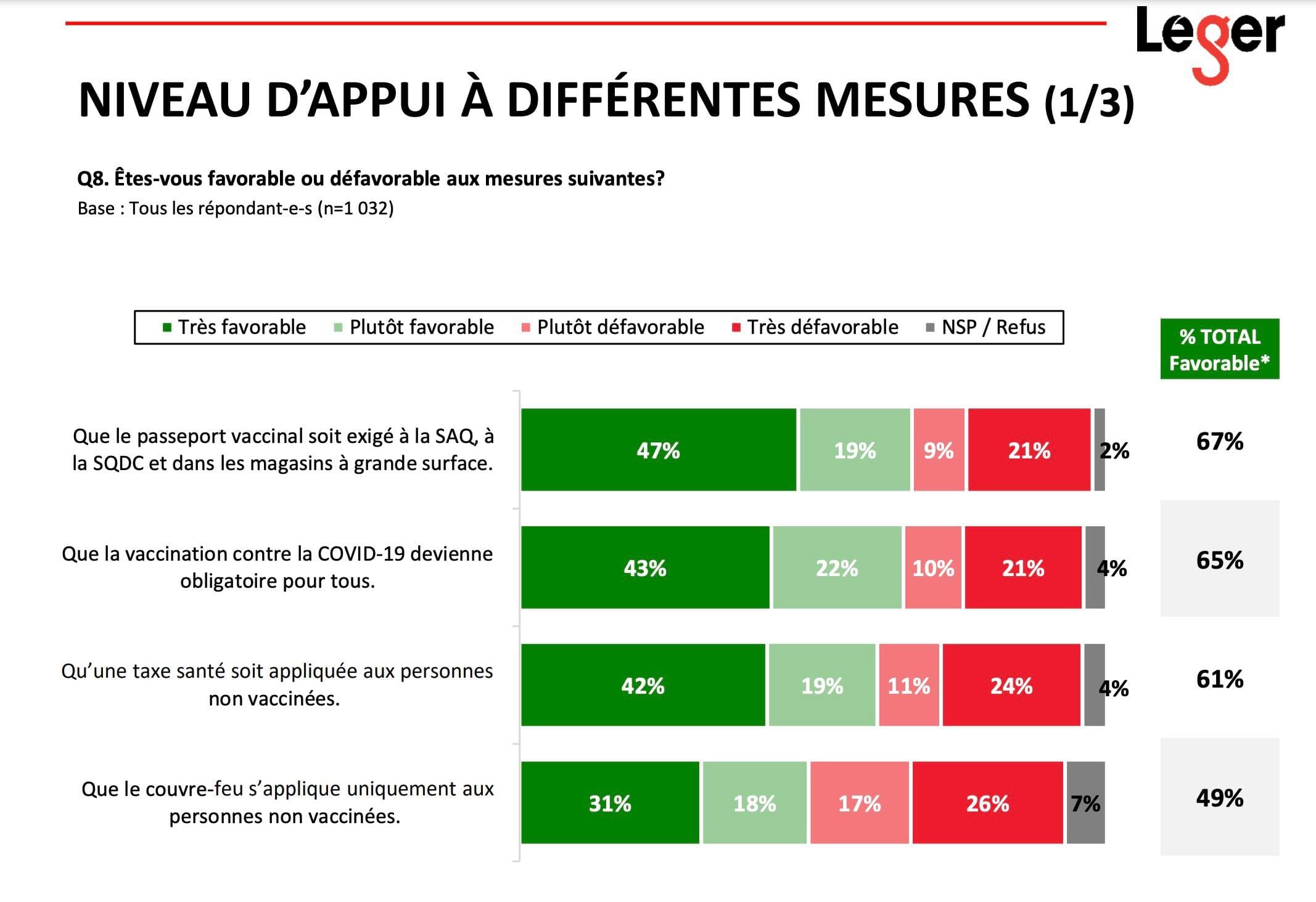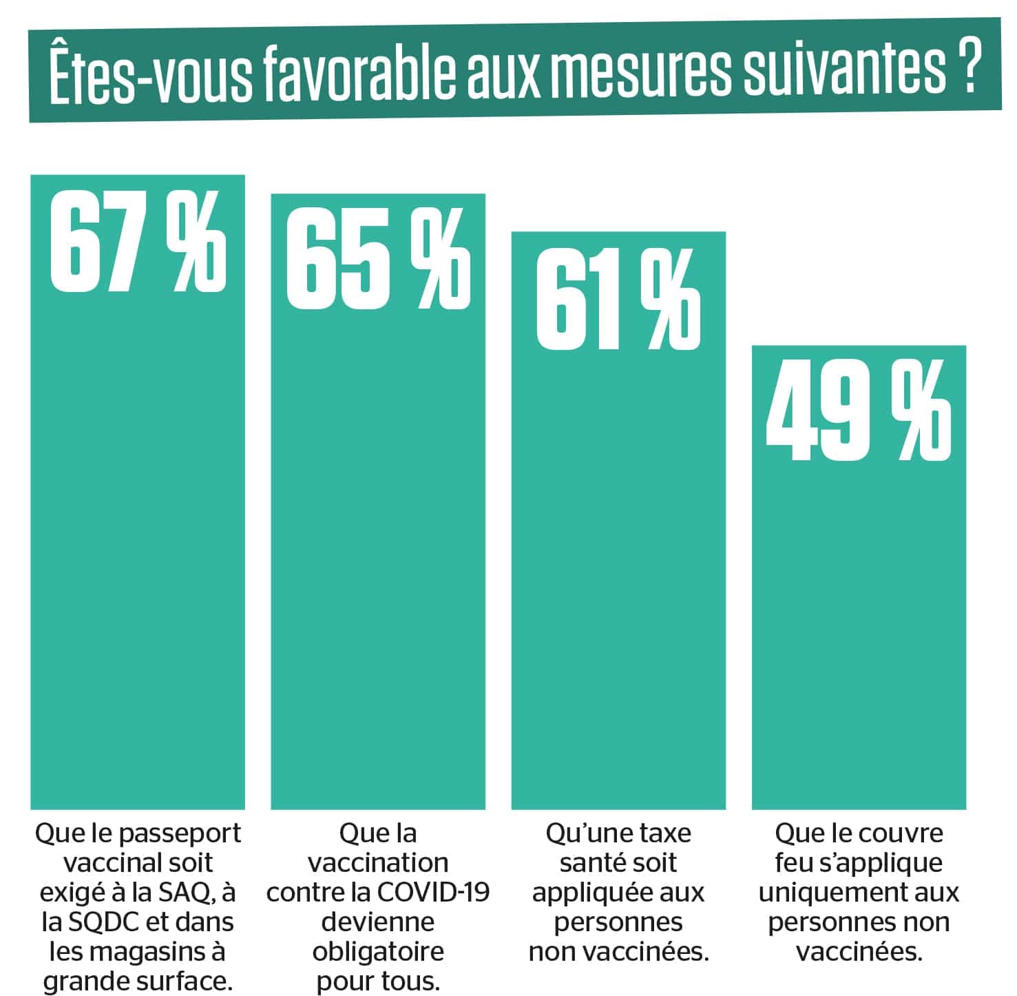 L’imposition du passeport vaccinal à la SAQ comme à la SQDC et, de façon plus large, la vaccination obligatoire, sont aussi largement appuyées.