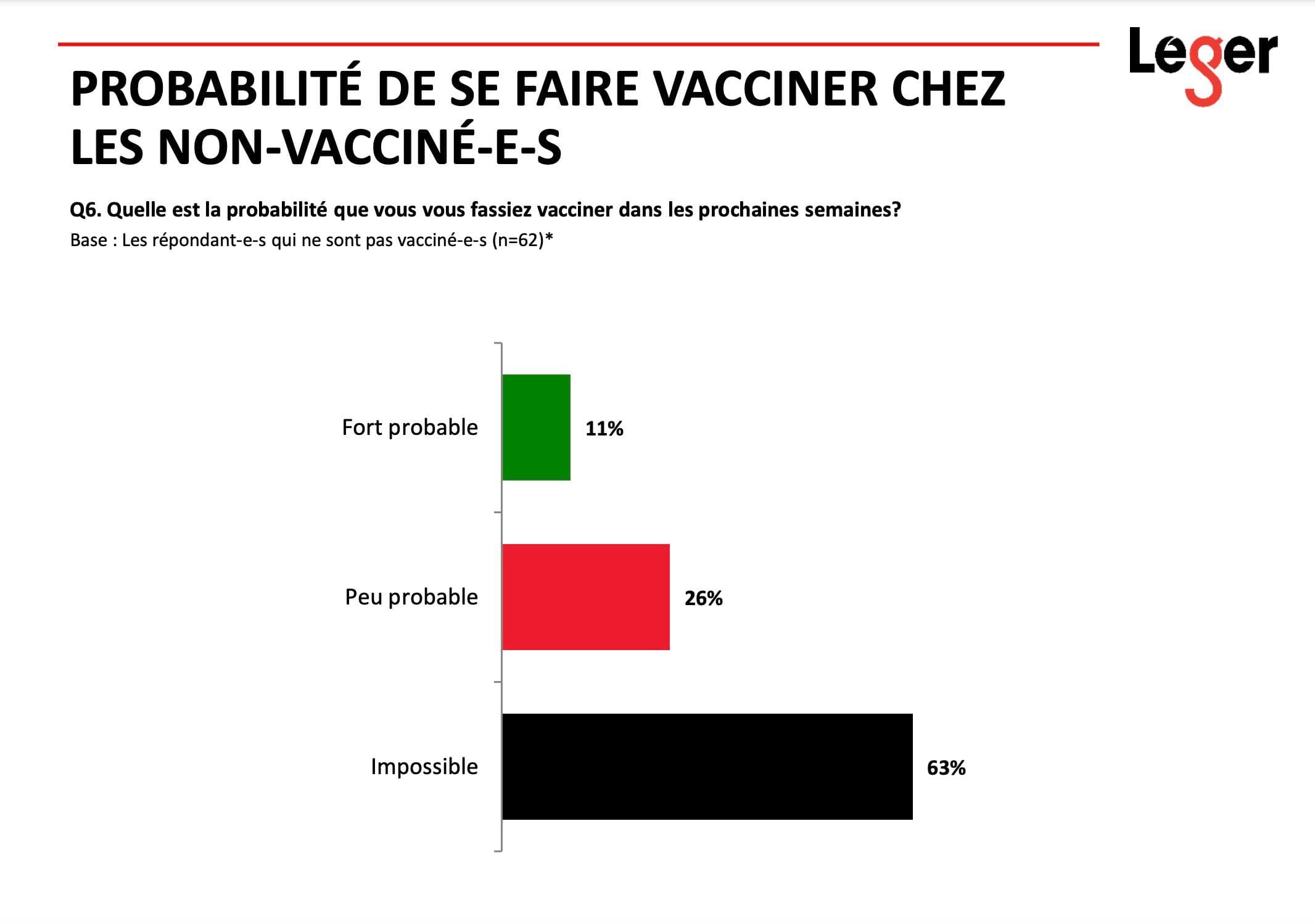 Tout compte fait, la firme Léger observe que le noyau dur de Québécois qui refuseront toujours de se faire vacciner se chiffre à environ 4 %. Et cela inclut ceux qui ont une condition médicale les empêchant de se faire vacciner.