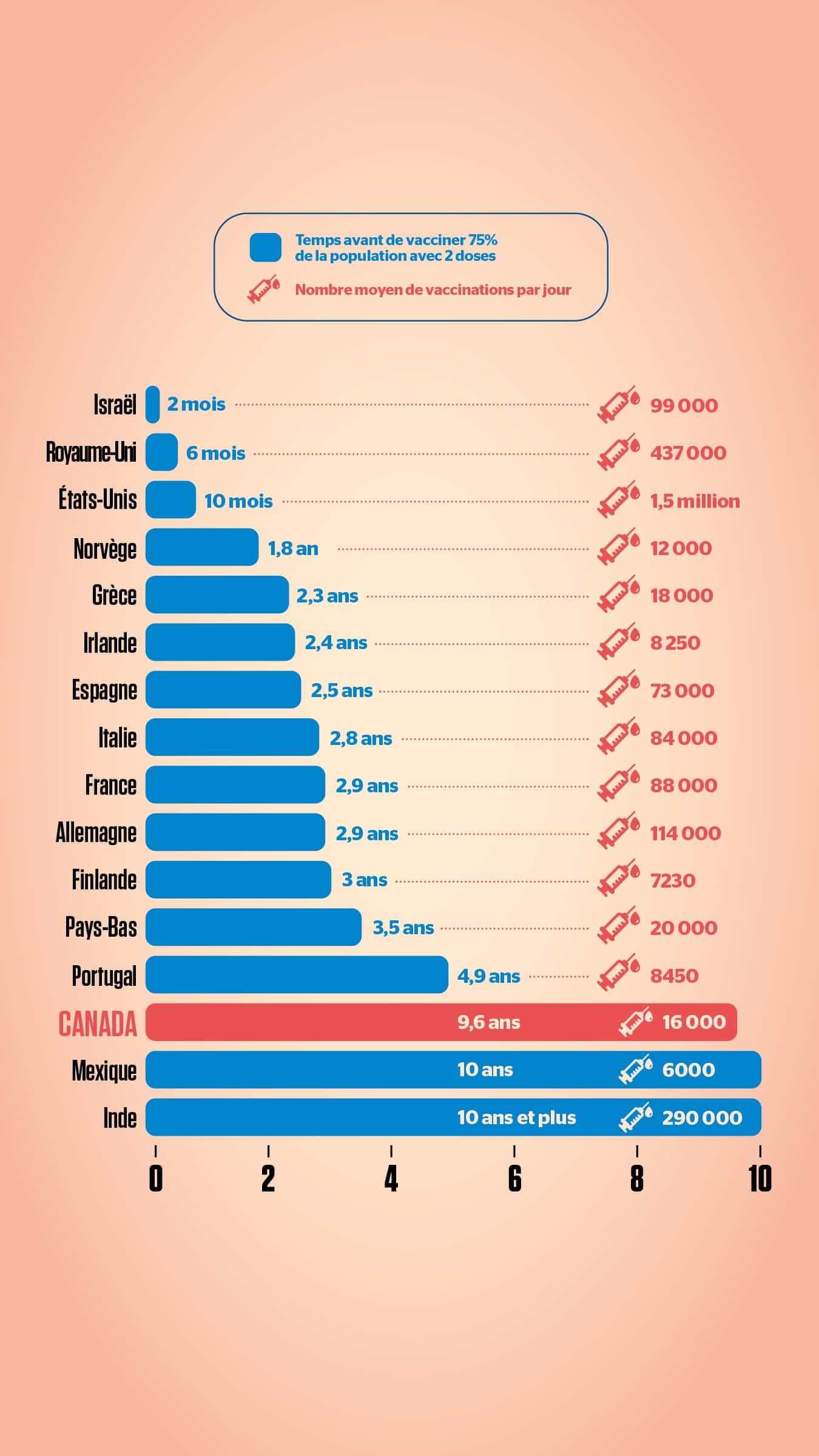 Selon des données recueillies par Bloomberg, 4,7 millions de doses de vaccin sont injectées chaque jour dans le monde entier, à une vitesse variable d’un pays à l’autre. Au Canada, les retards de livraison font trainer la moyenne à 16 000 doses par jour. Cela donnerait un délai de presque 10 ans pour atteindre l'immunité collective au pays.