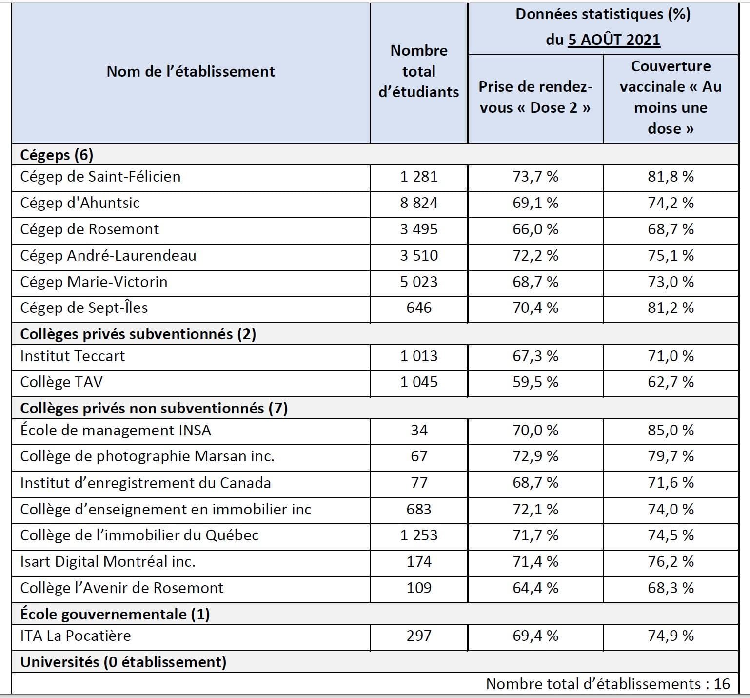 Voici la liste des cégeps dont la couverture vaccinale des étudiants est insuffisante: