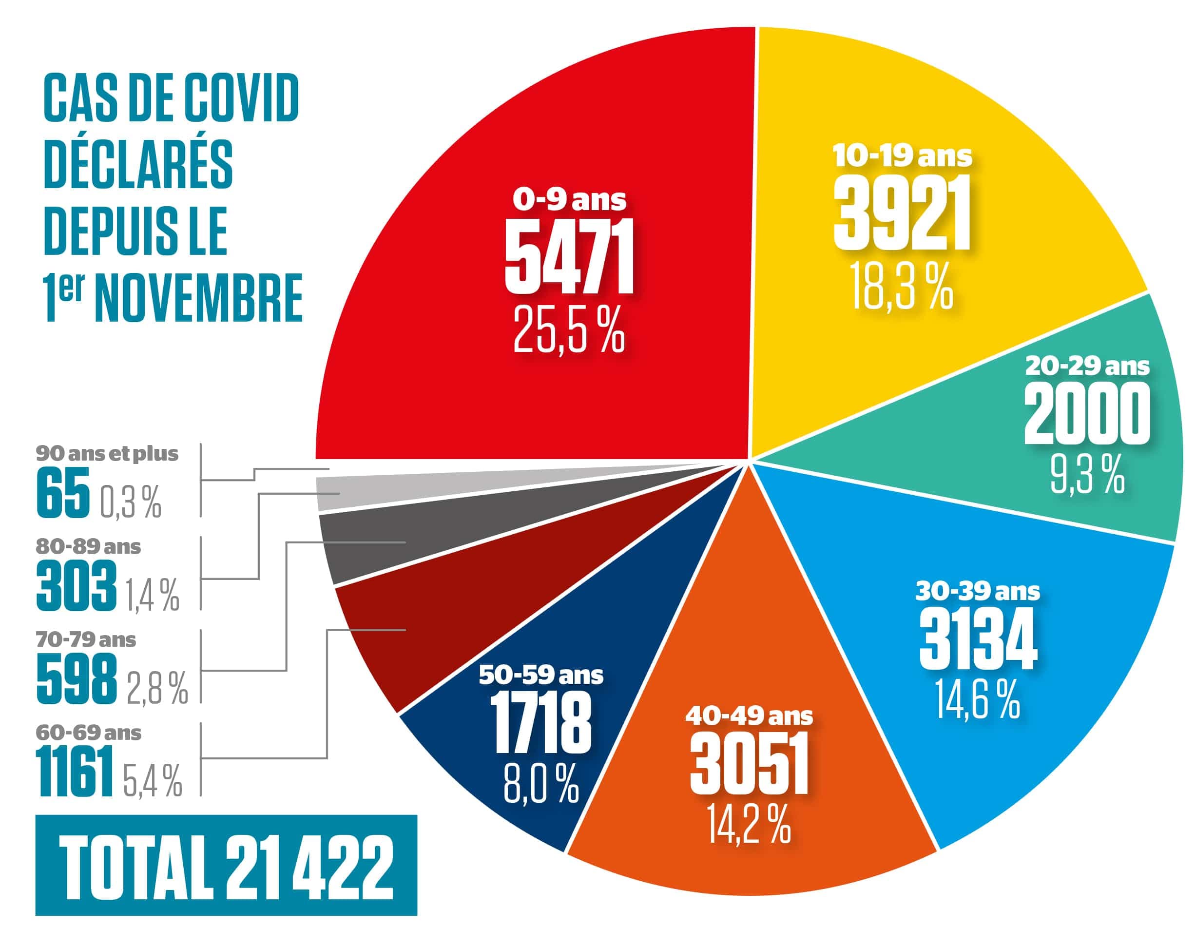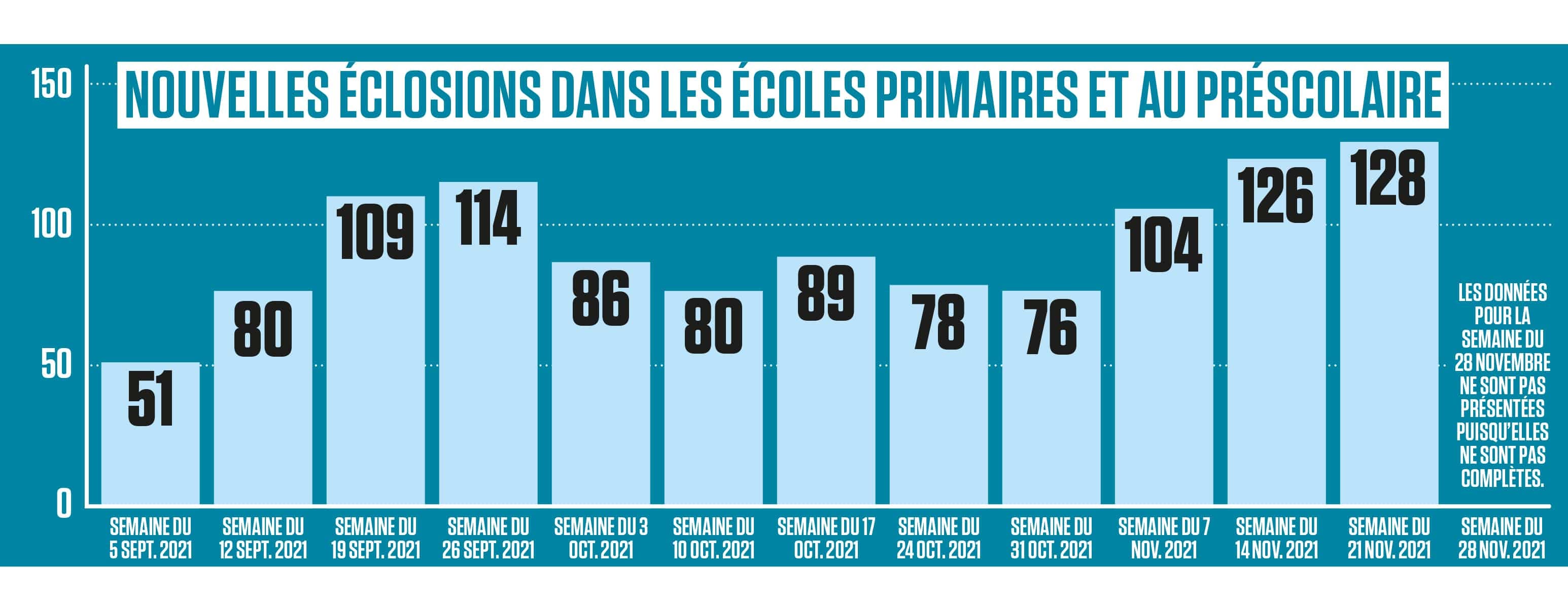 Cette hausse se répercute dans les écoles primaires où l’on a constaté un nombre record d’éclosions la semaine dernière, avec 128 éclosions. La campagne de vaccination chez les 5 à 11 ans devrait permettre de limiter la propagation, même si on ignore quelle protection le vaccin offrira contre le nouveau variant Omicron.