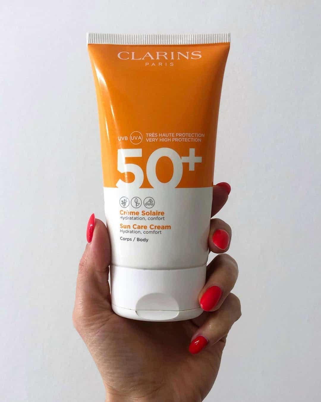Crème solaire visage FP# 50+ et lait solaire corps FPD 50+, Clarins, 38 $ et 46 $
