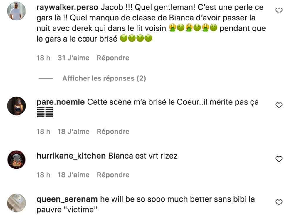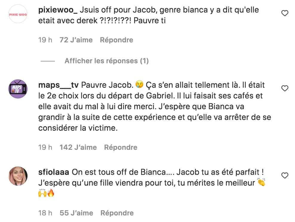 Question de grande rigueur journalistique, précisons que certains sont encore team Bianca dans tout ça. Ils expliquent que Jacob n'est pas un ange lui non plus, et qu'il a entre autres dit à Roxane qu'elle était son deuxième choix SANS LE DIRE À BIANCA.