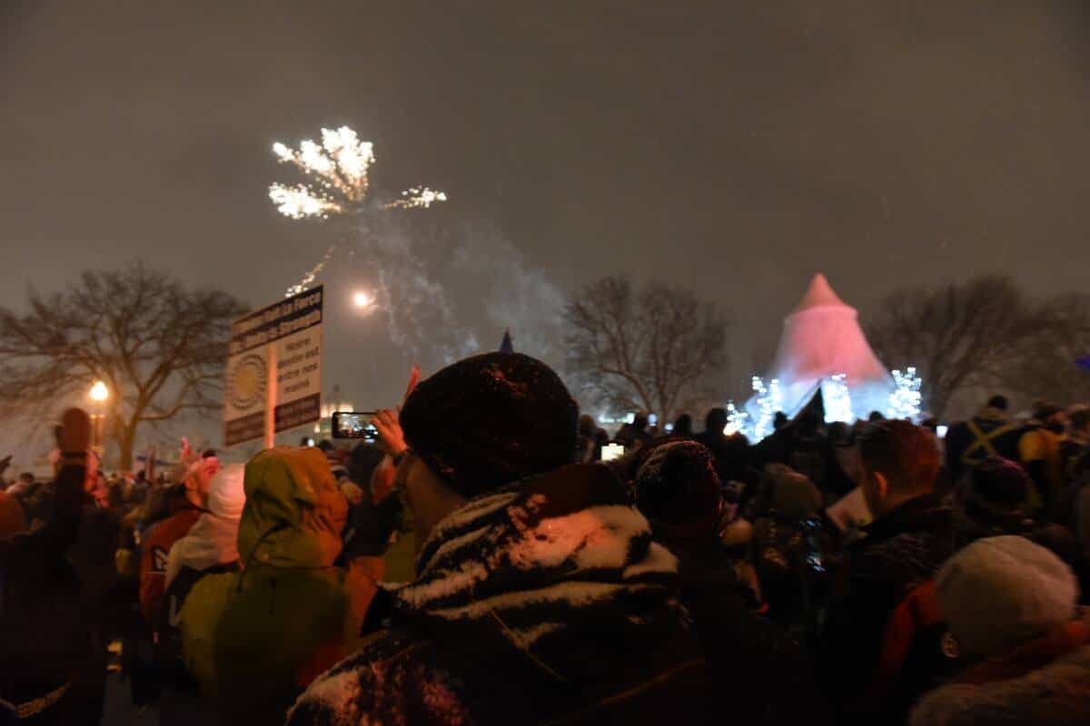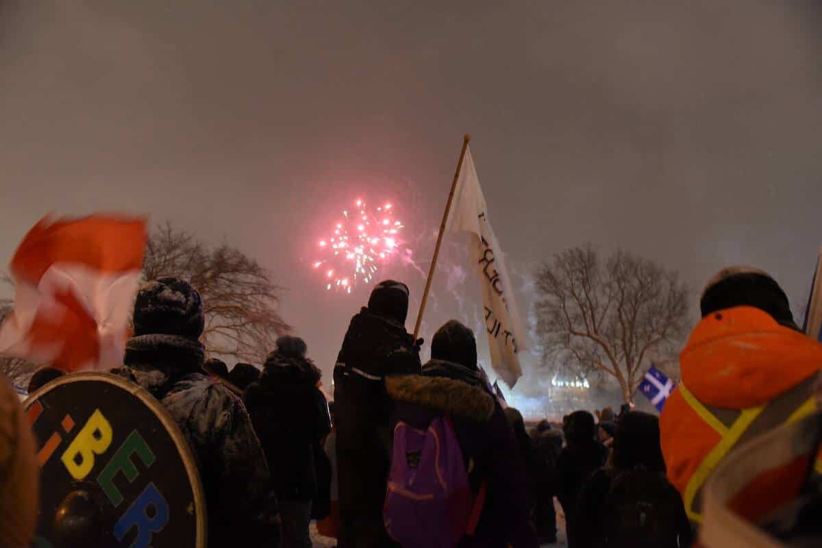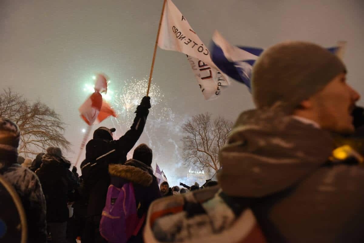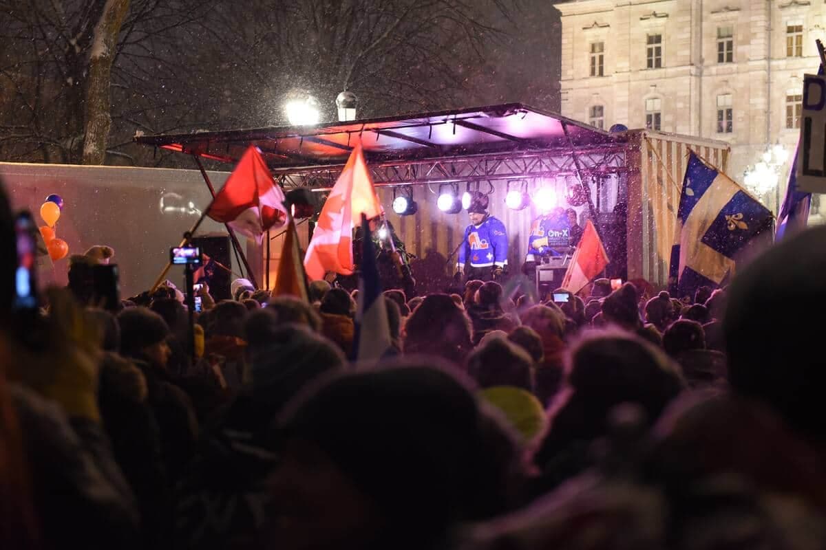 La place de la fontaine de Tourny ressemblait à un concert extérieur d’été en début d’après-midi, alors que des peluches étaient lancées dans la foule comme des ballons de plage. Les -10 °C affichés au mercure et les gros flocons qui tombaient sur la Capitale-Nationale n’ont pas semblé affecter les manifestants.