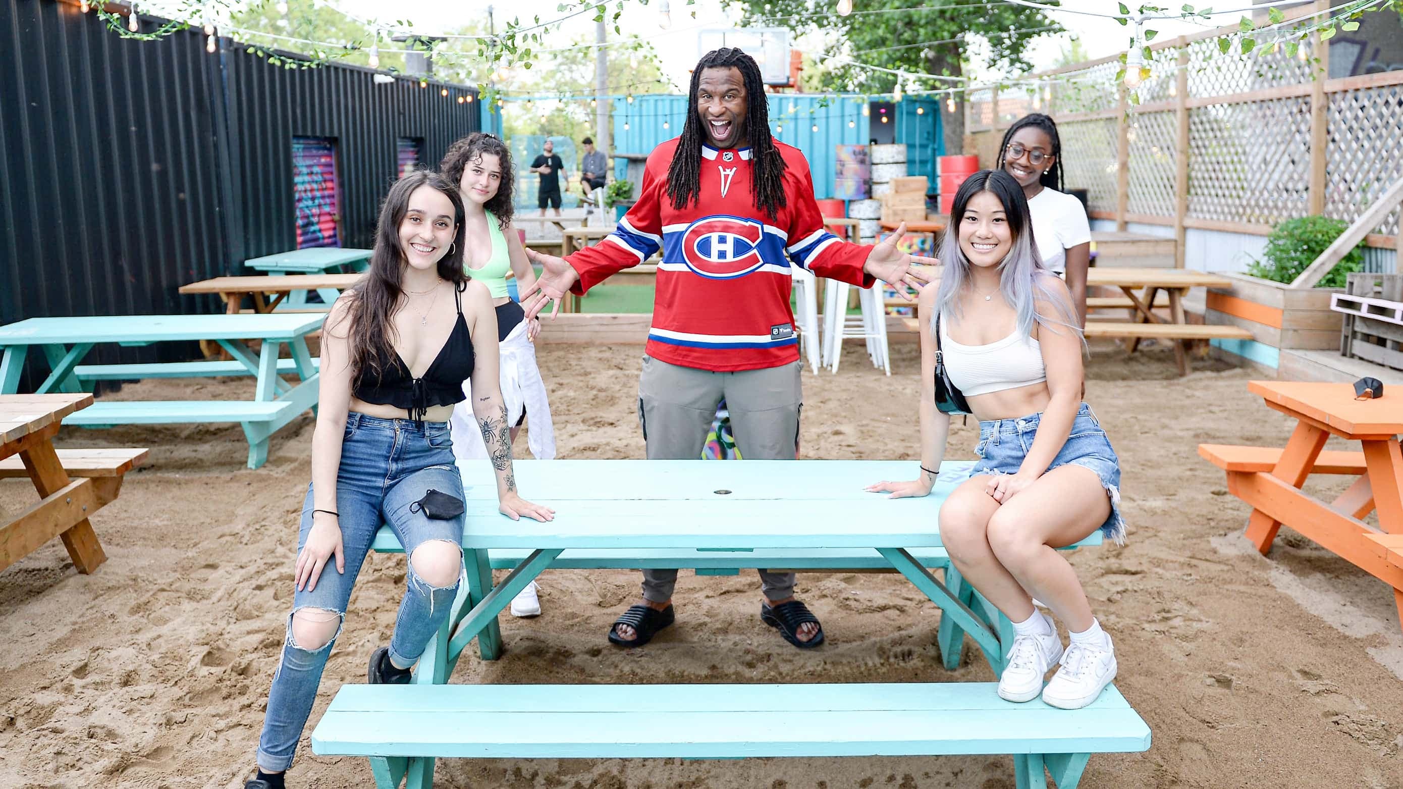 Georges Laraque est entouré des partisanes du Canadien, Emmanuelle Fauteux, Melisa Dumitras, Lenny St-Cyr et Mélanie Nguyen.