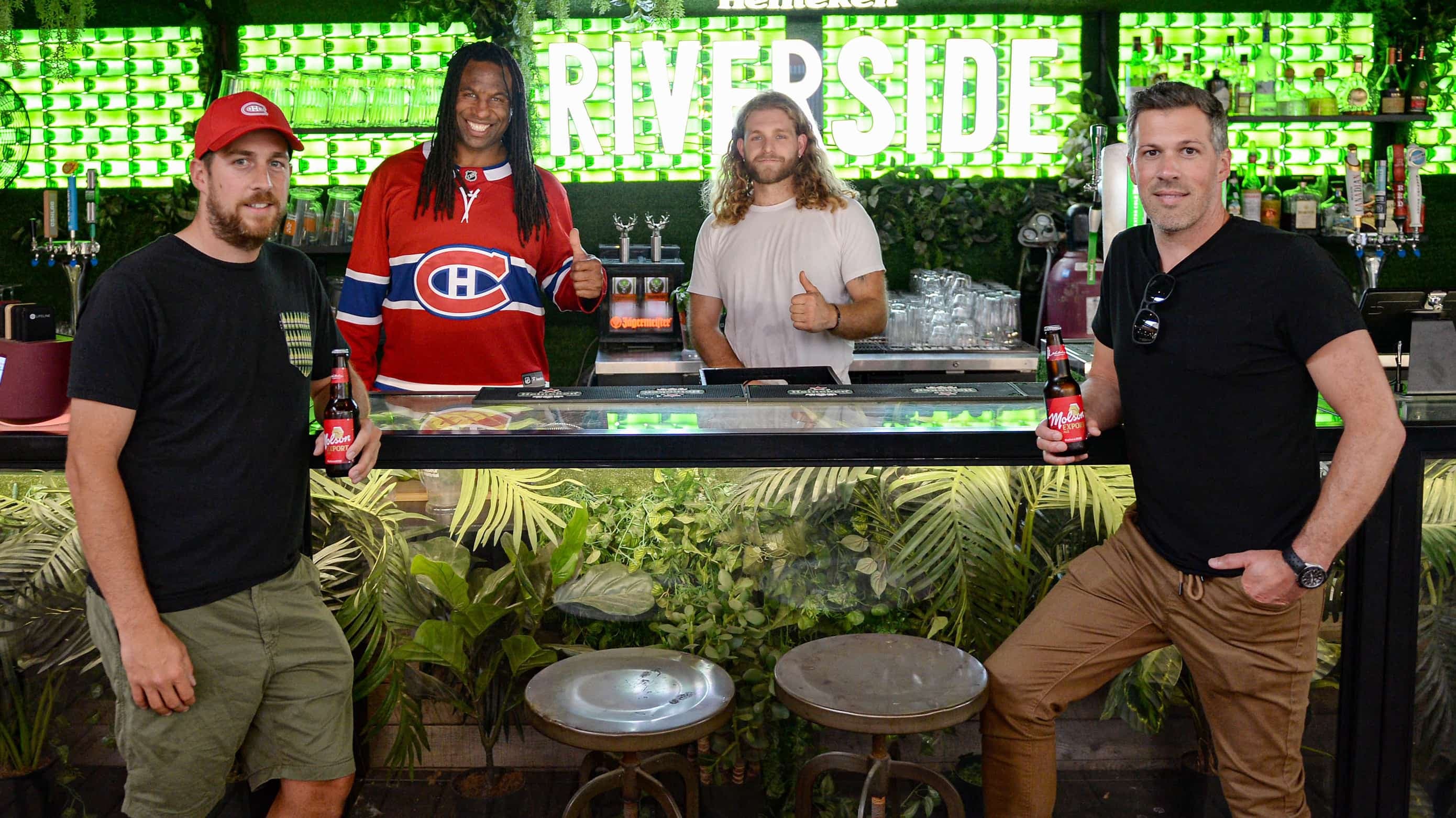 Lors de sa visite au Bar Terrasse St Henri, l’ancien joueur du Canadien, Georges Laraque était entouré de Mark Haggarty, brasserie Molson, Justin Jolin, propriétaire du bar et J.F. Paquette, brasserie Molson.