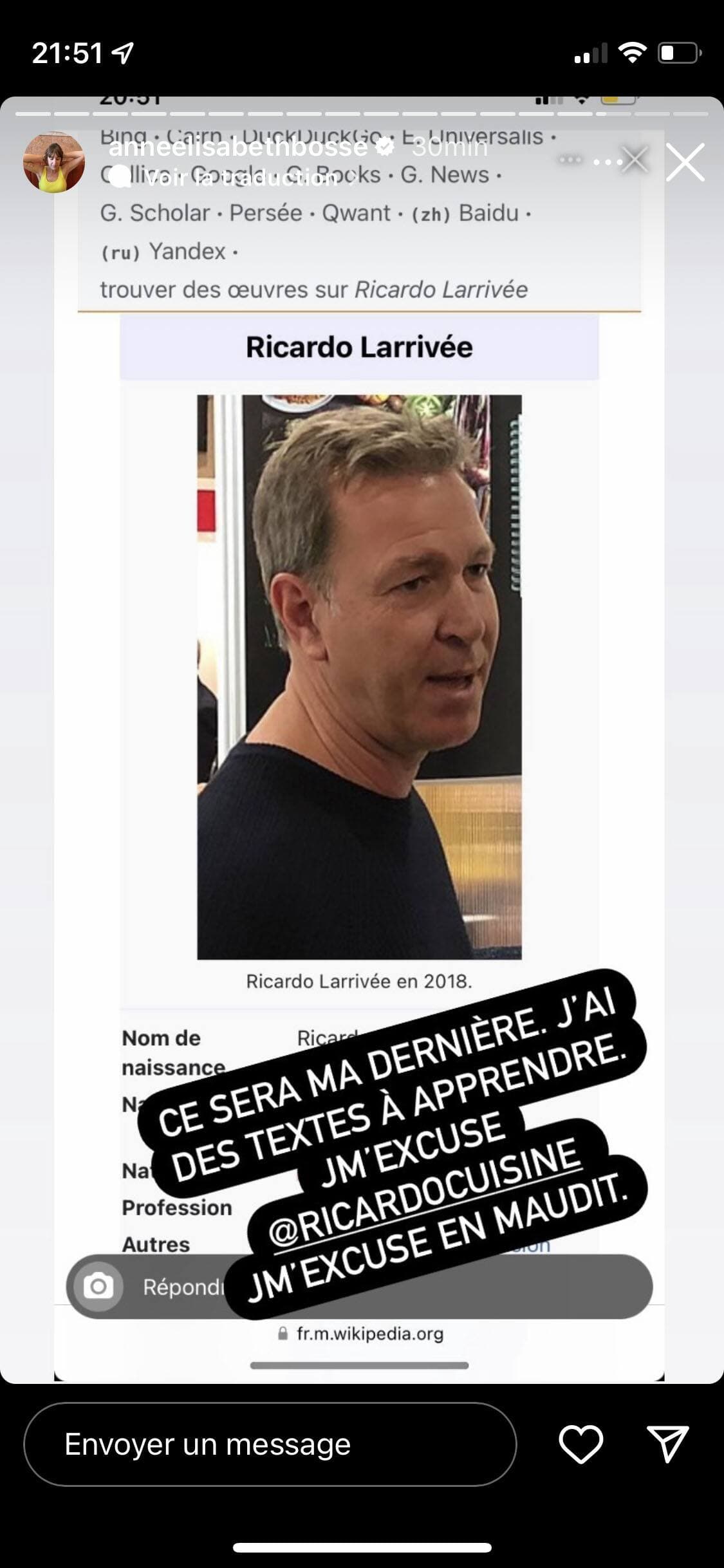 Mardi soir, Anne-Élisabeth Bossé a remarqué que la photo qui apparaissait sur sa page n'était pas des plus avantageuses: prise de loin, zoomée, avec un éclairage qui permet à peine de distinguer son visage. La comédienne a partagé le résultat en story Instagram.