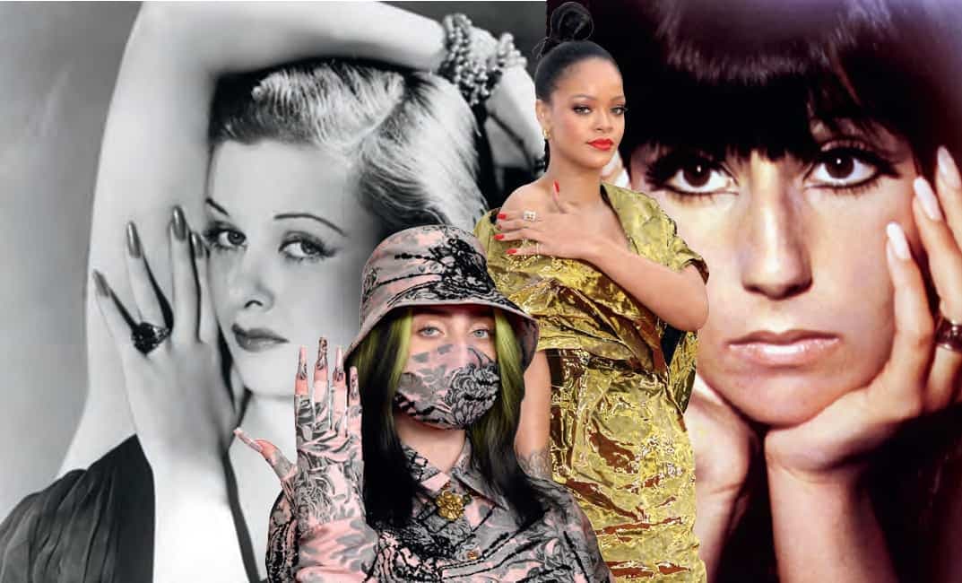 Les tendances font leur chemin et, dans les années 50, les longues griffes arrondies, rouges de préférence, ont la cote, tandis que les sixties privilégient plutôt les nuances pastel. La mode excentrique des années 80 préfère quant à elle les couleurs fluo et les longs ongles à bout carré, avant que l’ère grunge ne raccourcisse les griffes et ne les teinte de noir.