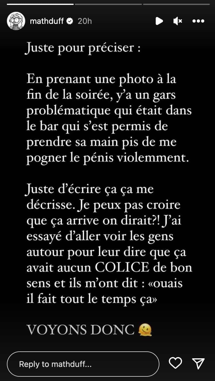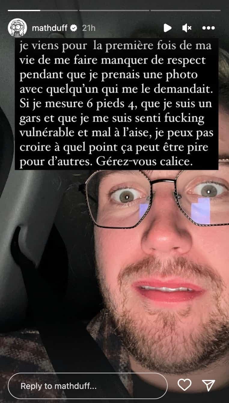 «Je viens pour la première fois de ma vie de me faire manquer de respect pendant que je prenais une photo avec quelqu’un qui me le demandait. Si je mesure 6 pieds 4, que je suis un gars et que je me suis senti fucking vulnérable et mal à l’aise, je peux pas croire à quel point ça peut être pire pour d’autres. Gérez-vous calice.»