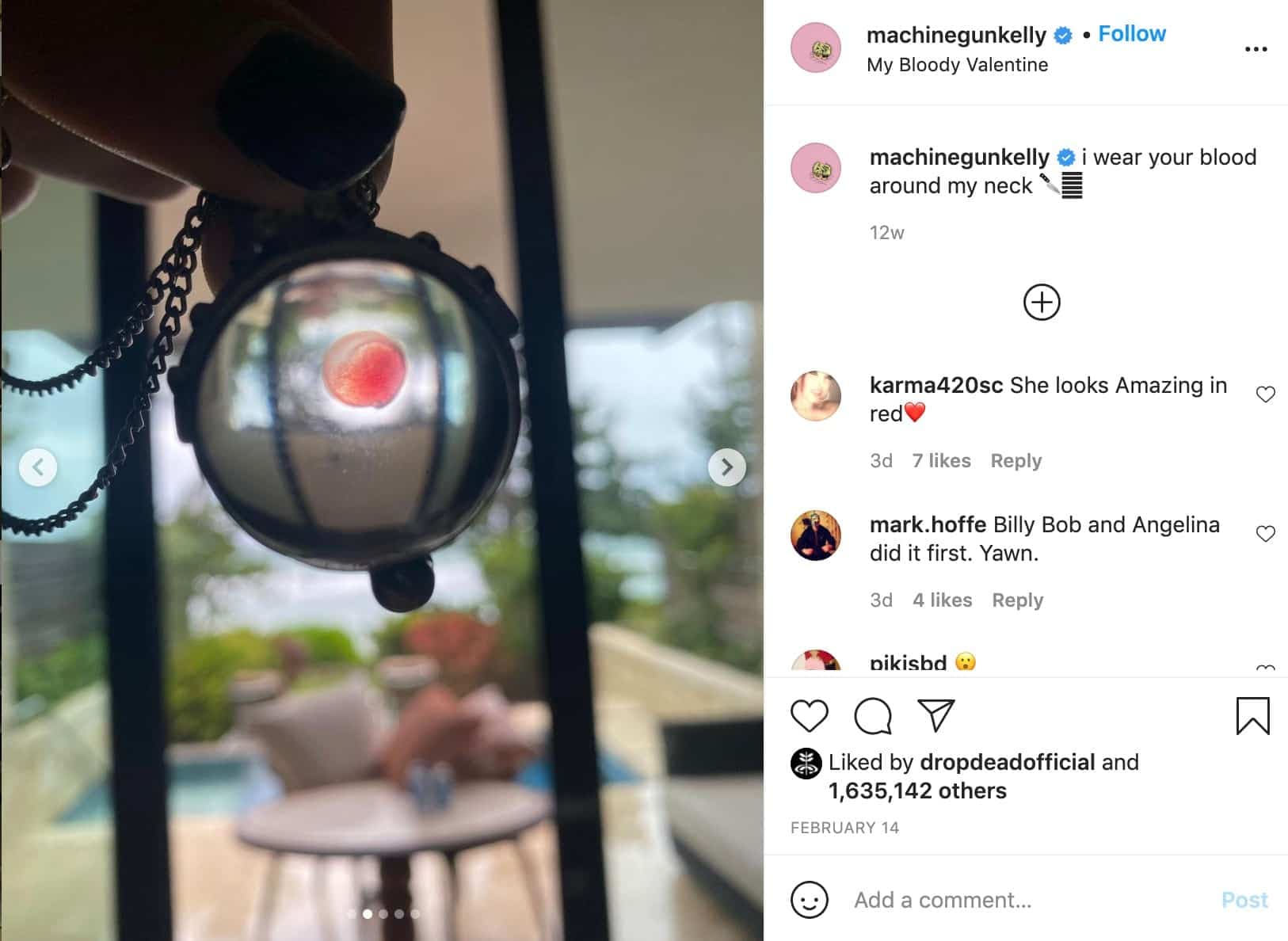 Détrompez-vous, ce n’était pas un bijou ordinaire. Sur la chaîne reposait une fiole contenant une goutte de sang ayant déjà circulé dans les veines de sa conjointe, la comédienne Megan Fox.