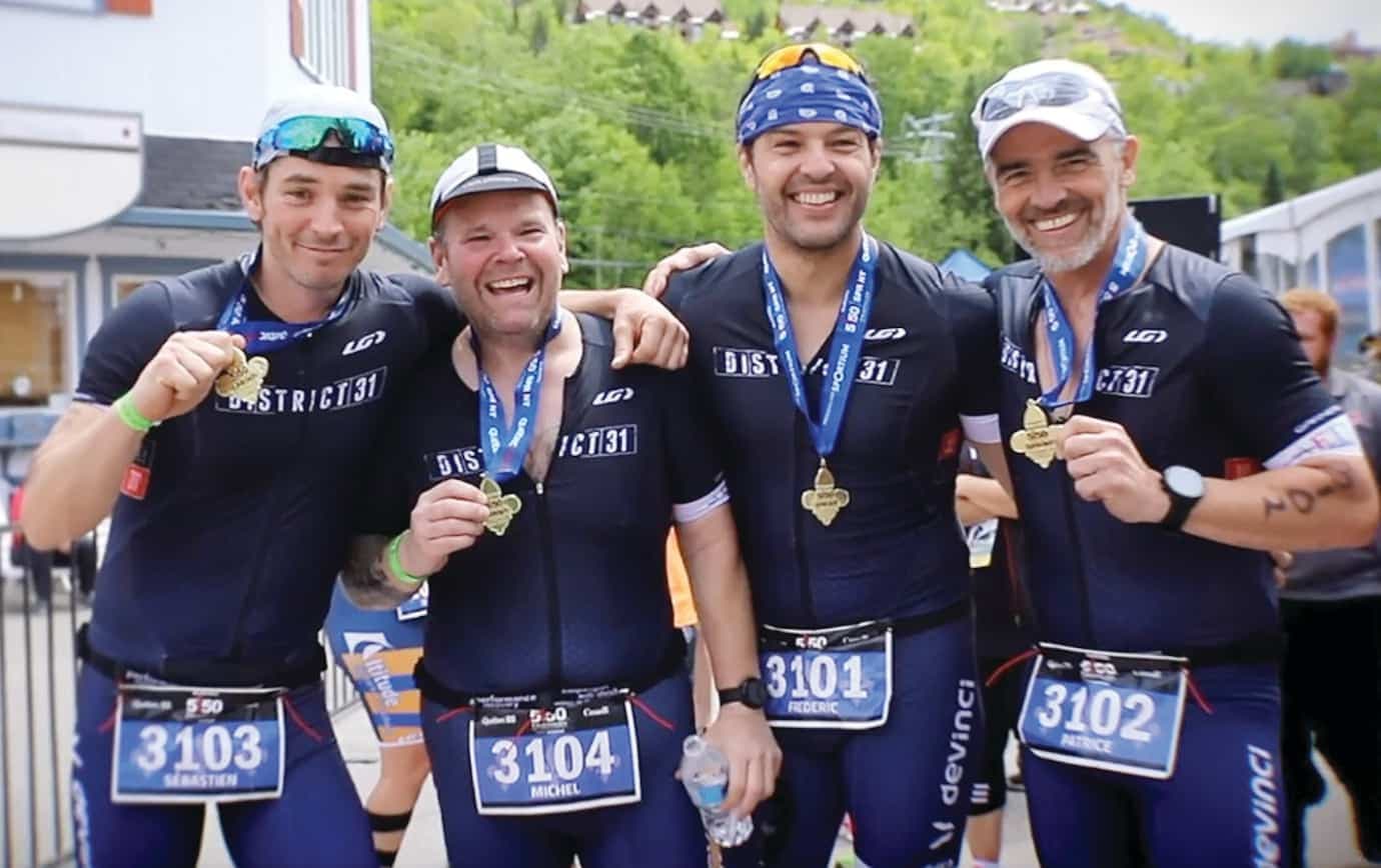 M.: Oui, vraiment! (rires) On parlait du défi Ironman, que tu avais fait en équipe avec Sébastien Delorme à vélo, Maxim Martin à la natation et toi à la course. Quand je vous ai dit que j’aimerais faire un triathlon, je n’avais pas pris le temps d’y penser! Mais vous avez dit oui et, 72 heures plus tard, j’étais inscrit avec toi, Sébastien Delorme et Frédéric Cloutier pour le triathlon!