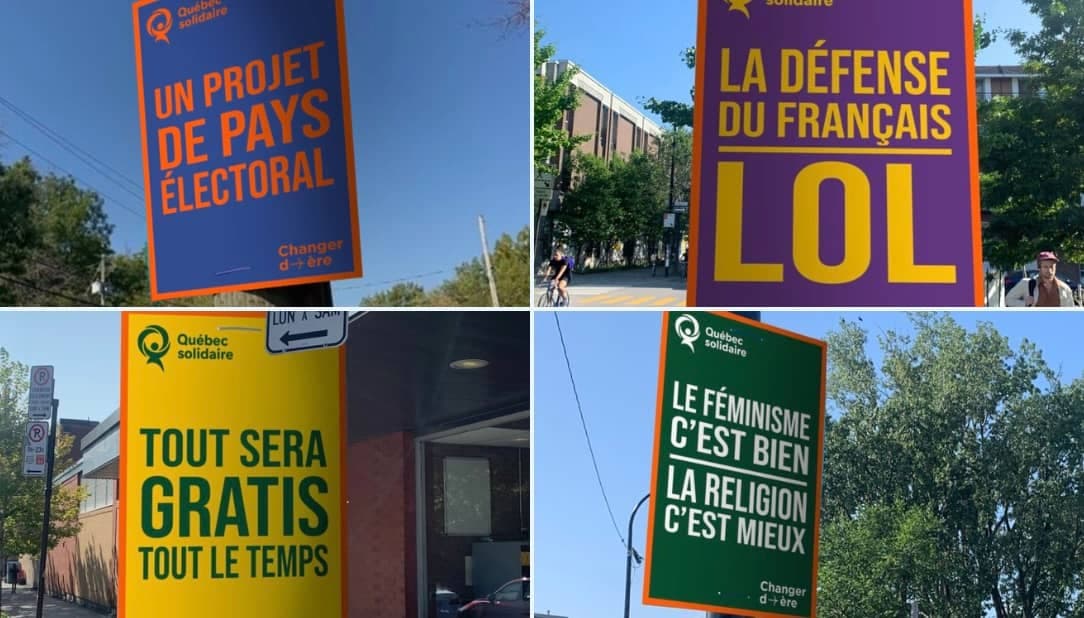 «La défense du français, LOL», «Tout sera gratis tout le temps»: peut-être avez-vous vu passer sur les réseaux sociaux des images de pancartes électorales de Québec solidaire avec des slogans farfelus. Bien évidemment, il s’agit de photomontages, qui ont été publiés il y a quelques jours par La Pravda, une page de satire politique.