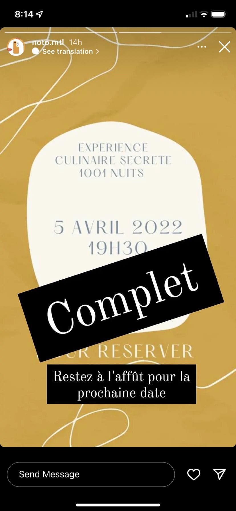 Par exemple, la prochaine expérience culinaire aura lieu le 5 avril prochain. Les places se sont réservées en moins d’une heure environ. Le thème sera 1001 Nuits et le repas coûtera 64$ par personne.