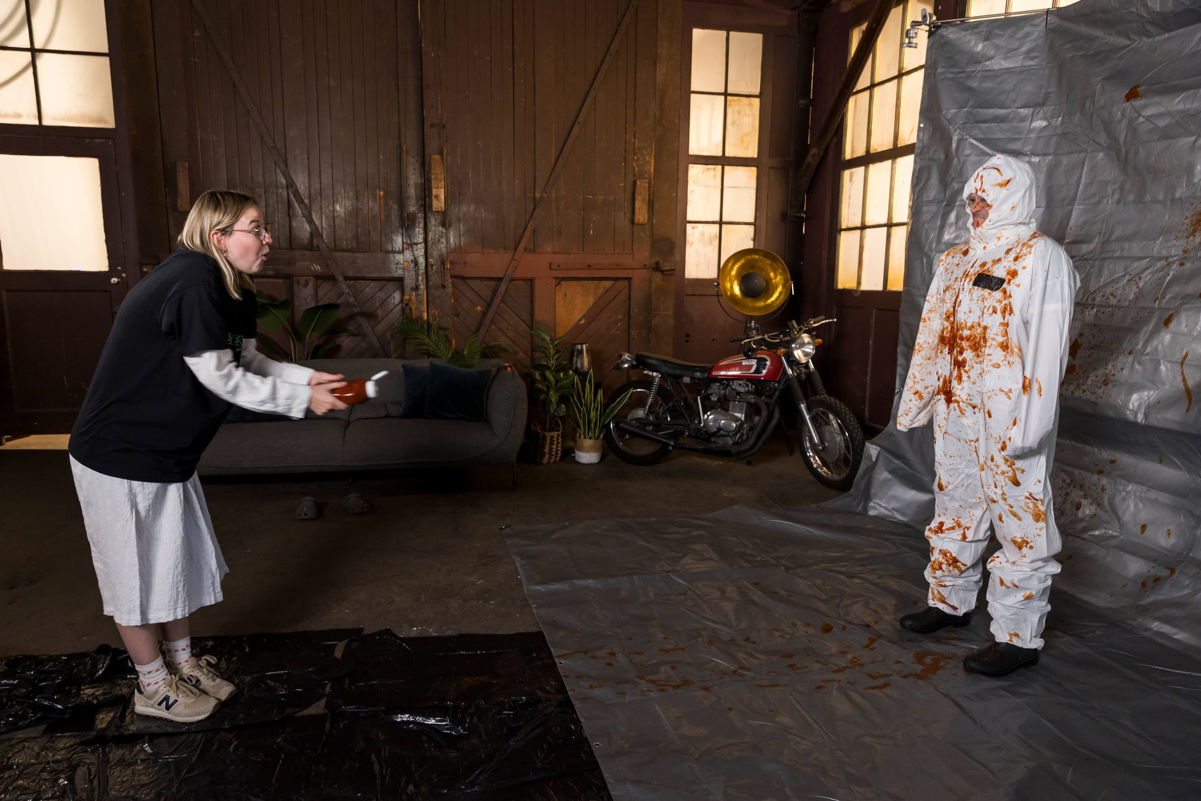 Qui aurait cru qu'un jour je me retrouverais à asperger Patrice Bélanger de ketchup? C'est pourtant ce qui s'est produit lorsque l'équipe de production a sollicité l'aide des journalistes présents pour une expérience «hautement scientifique»: déterminer la meilleure façon d'enduire quelqu'un de ketchup. À notre disposition: bouteille, sachets individuels, cuillère transformée en catapulte et, mon préféré, un fusil à eau rempli du fameux condiment! L'expérience s'est révélée étonnamment divertissante, et Patrice, vêtu de son costume blanc, a fait preuve d'un excellent esprit sportif en riant avec nous, même quand mon jet de ketchup a atterri directement sur son visage. Sans rancune, Patrice!