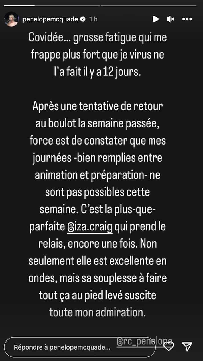 Dans sa story sur Instagram, Pénélope McQuade indique que c'est Isabelle Craig qui la remplacera au pied levé.