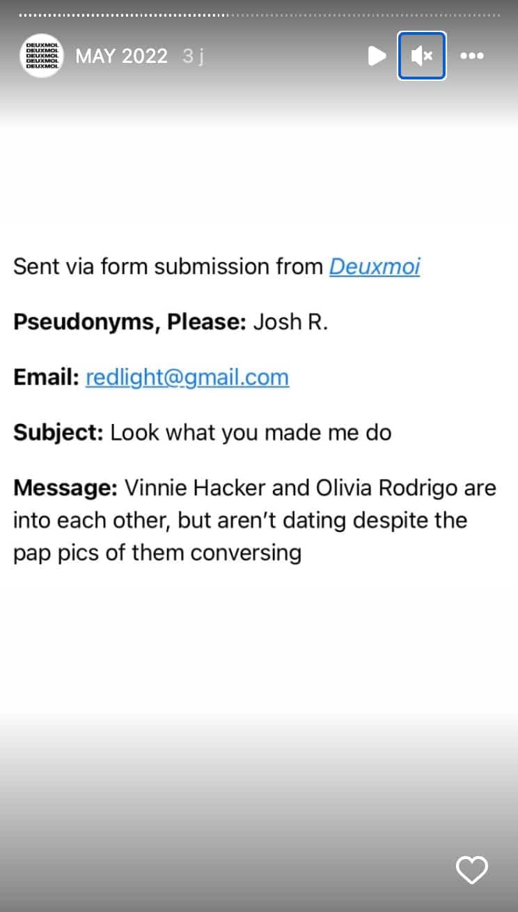 Olivia et Vinnie n’ont pas (encore) commenté la situation. Cependant, le populaire compte Instagram à potins deuxmoi a partagé récemment un message anonyme confirmant qu’Olivia et Vinnie ont des sentiments l’un pour l’autre, mais que pour le moment ils ne forment pas un couple.