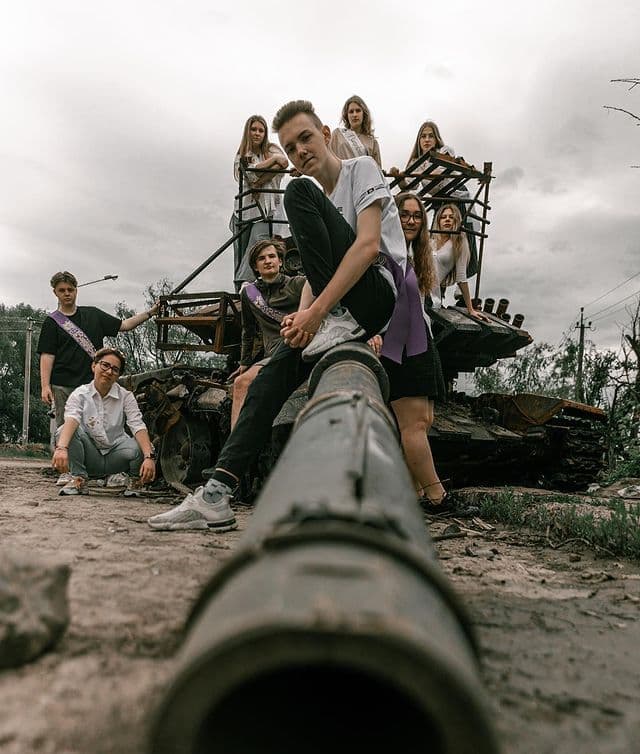 Un photographe a immortalisé de manière «surréaliste» un moment charnière dans la vie d’un adolescent, en photographiant un groupe de finissants ukrainiens dans les ruines de Tchernihiv, une ville de l’est de l’Ukraine détruite par les troupes russes.