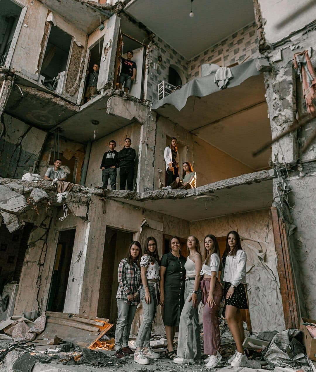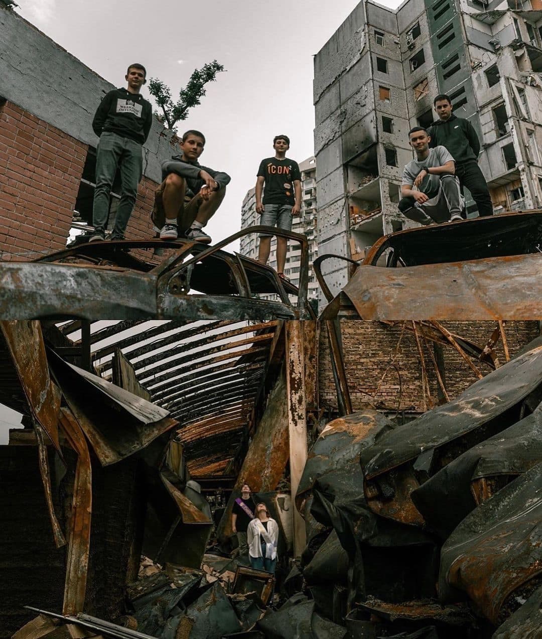 Stanislav Senyk a photographié les adolescents dans un cratère provoqué par une explosion, dans un immeuble dénudé de ses murs ou encore sur un tank ennemi abandonné.