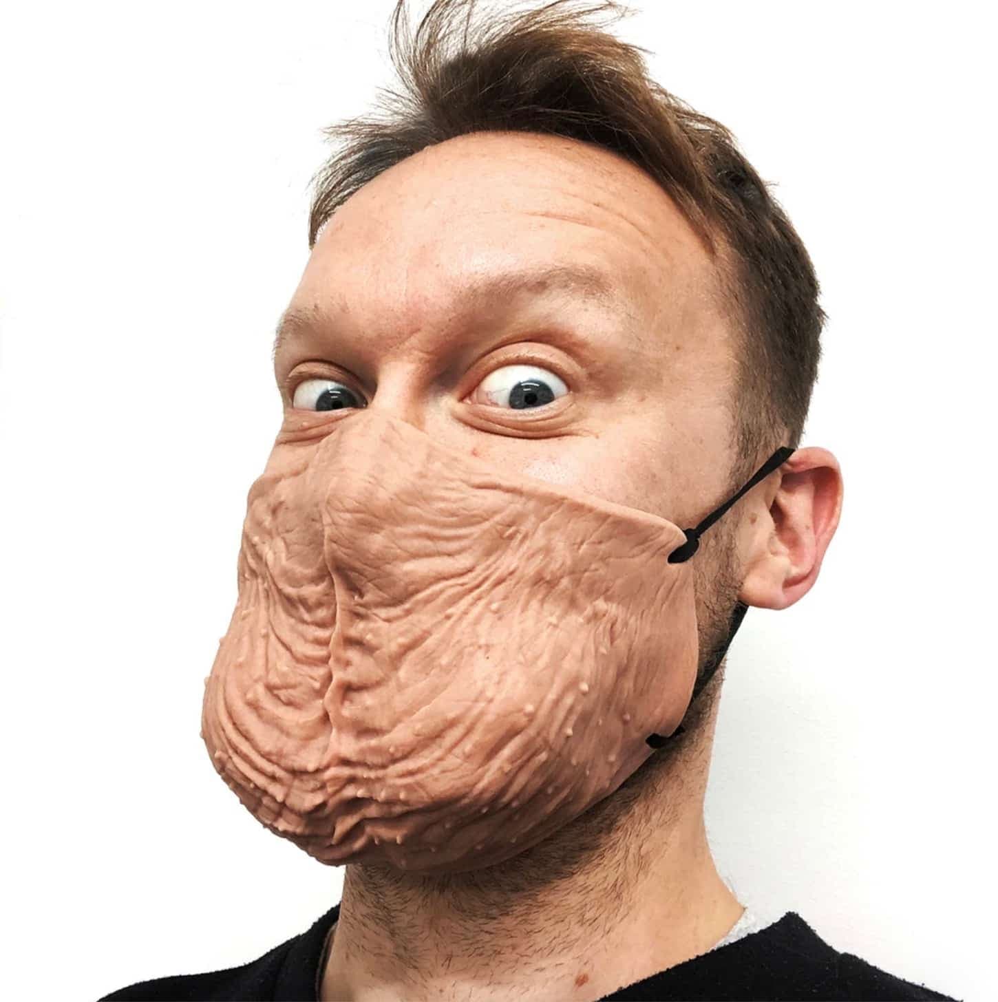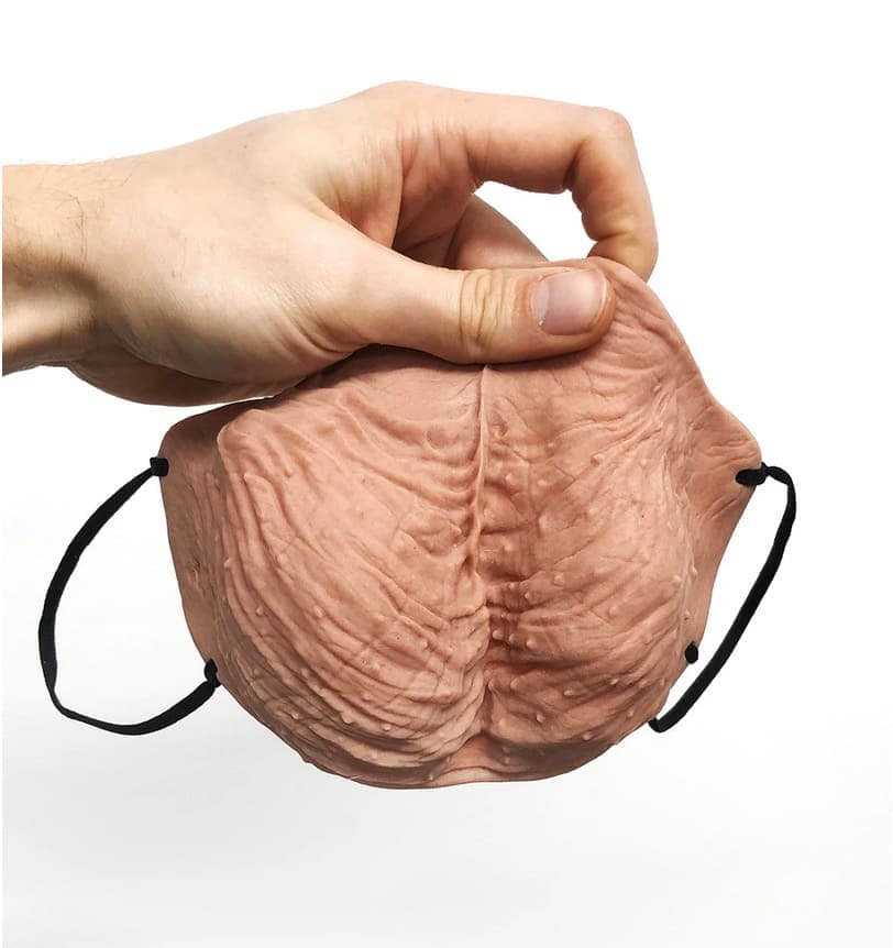 En créant un masque qui ressemble à une paire de testicules dans leur sac naturel.