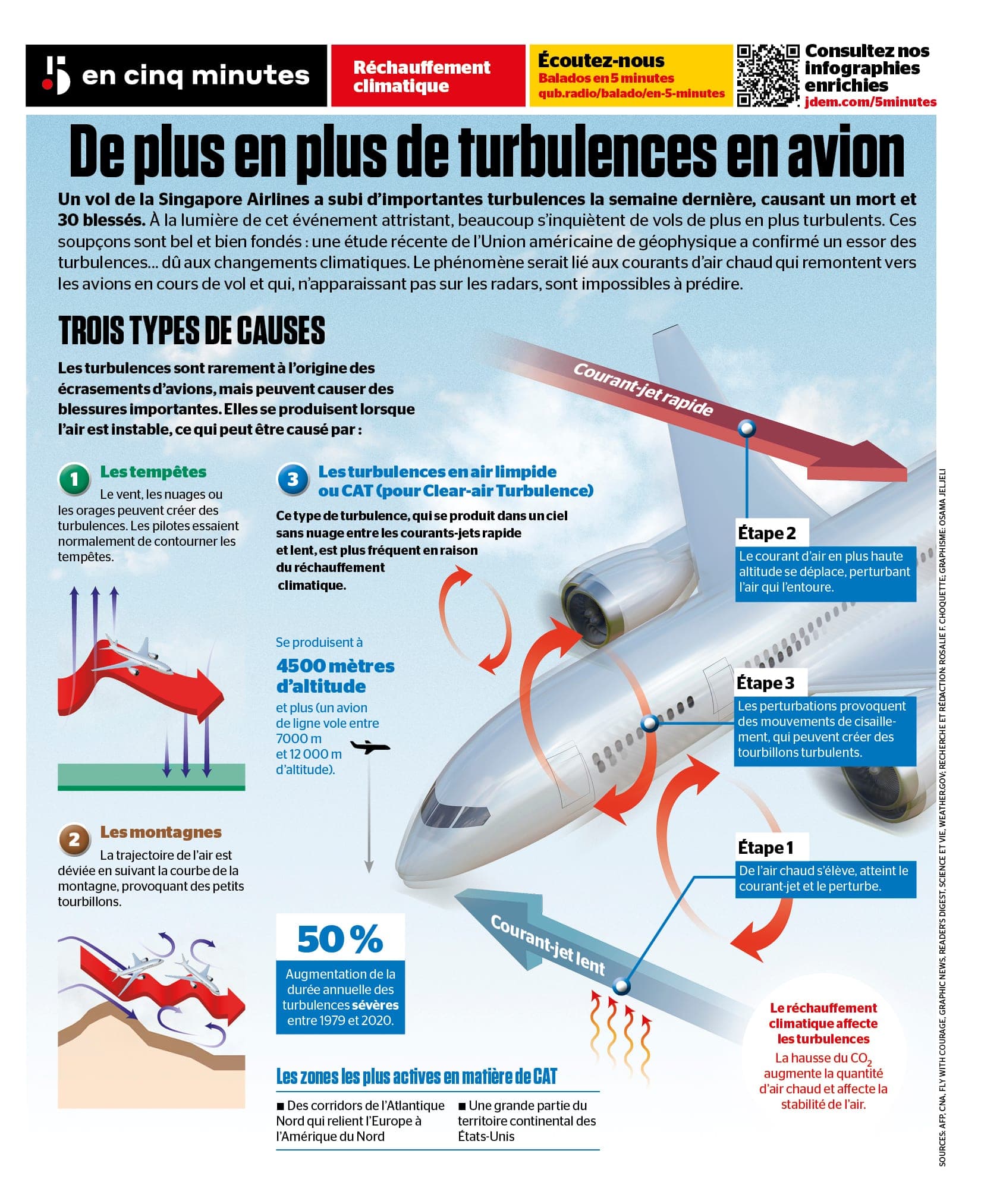 À la lumière de cet événement attristant, beaucoup s’inquiètent de vols de plus en plus turbulents. Ces soupçons sont bel et bien fondés : une étude récente de l’Union américaine de géophysique a confirmé un essor des turbulences... dû aux changements climatiques. Le phénomène serait lié aux courants d’air chaud qui remontent vers les avions en cours de vol, et qui, n’apparaissant pas sur les radars, sont impossibles à prédire.
