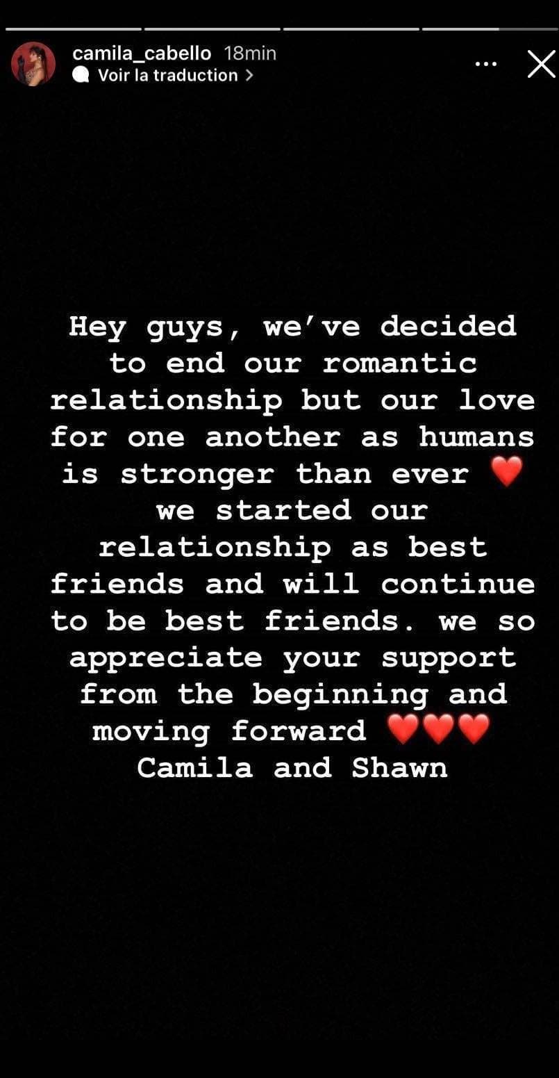 C'est sur Instagram, en soirée, que le couple a annoncé la triste nouvelle par le biais d'une story publiée sur les comptes de Shawn et de Camila.