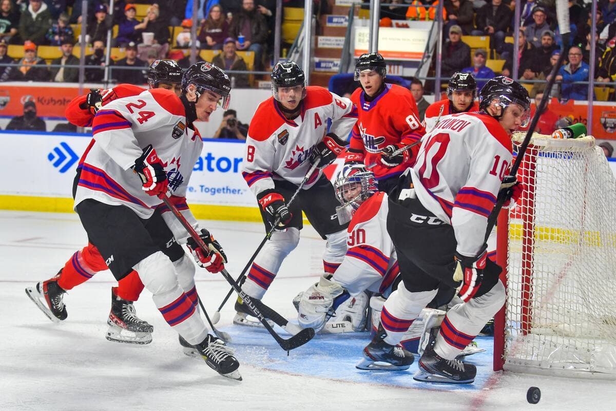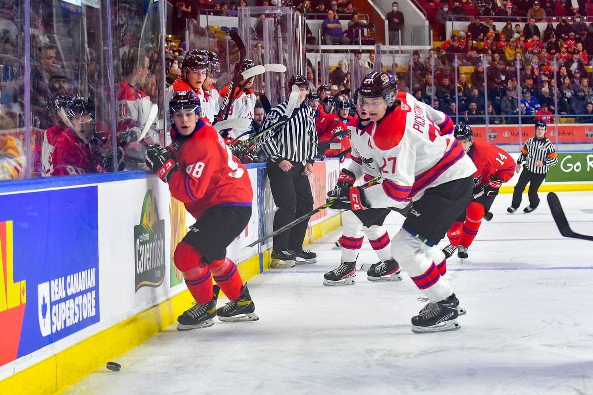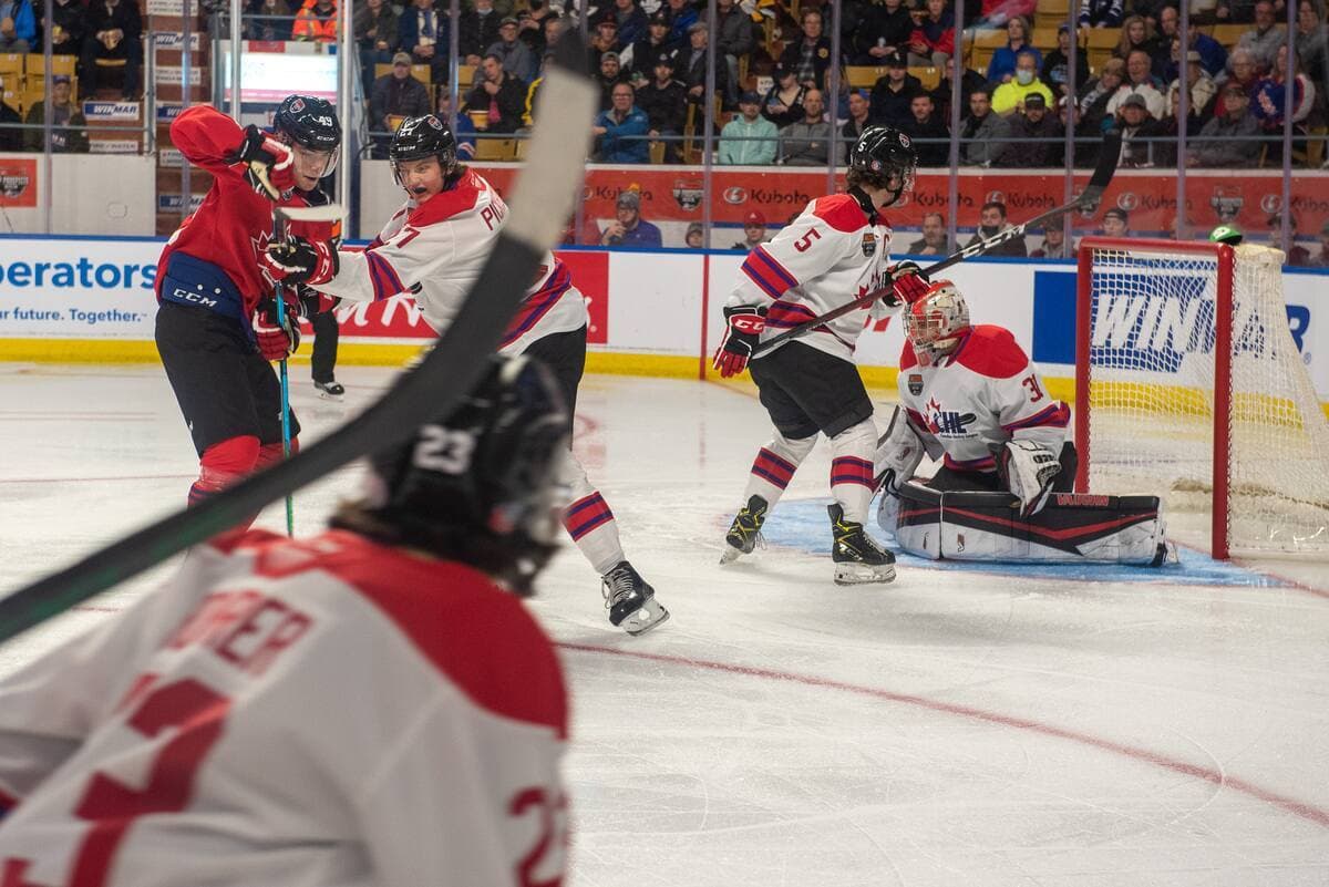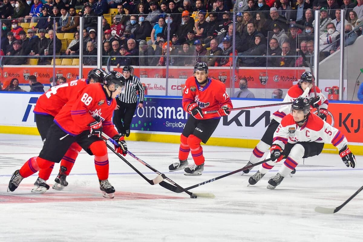 De l’autre côté, les Blancs ont pris contrôle de la rencontre, inscrivant trois buts sans réplique, dont celui de l’attaquant des Remparts de Québec Nathan Gaucher, qui, bien placé devant le filet, a redirigé une passe de son partenaire de trio et membre des Olympiques de Gatineau Antonin Verreault pour faire 3 à 1.