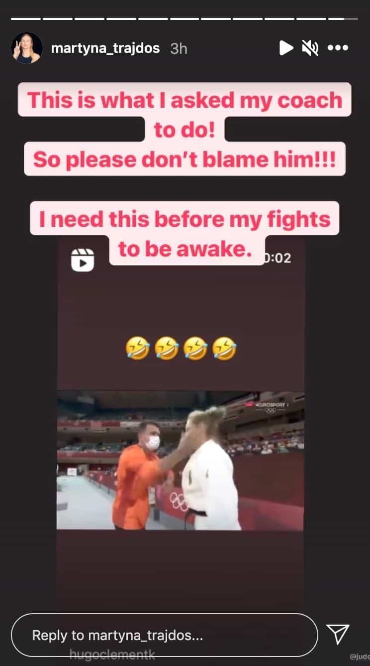 Juste avant de monter sur le tatami, Martyna Trajdo s’est tournée vers son entraîneur, qui l’a agrippée par son gi et l'a secouée violemment, pour ensuite lui donner deux violentes gifles au visage, une de chaque côté.