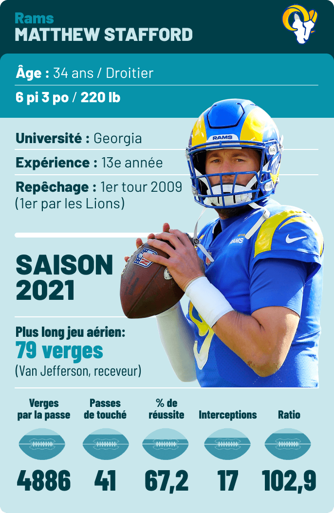 Le vétéran quart-arrière qui a soufflé lundi 34 bougies en est à sa 13e saison dans la NFL. Même s’il a connu de très bons moments sur le plan individuel avec des statistiques enviables, Stafford ne s’est jamais approché du Super Bowl lors de ses 12 premières saisons à Detroit.