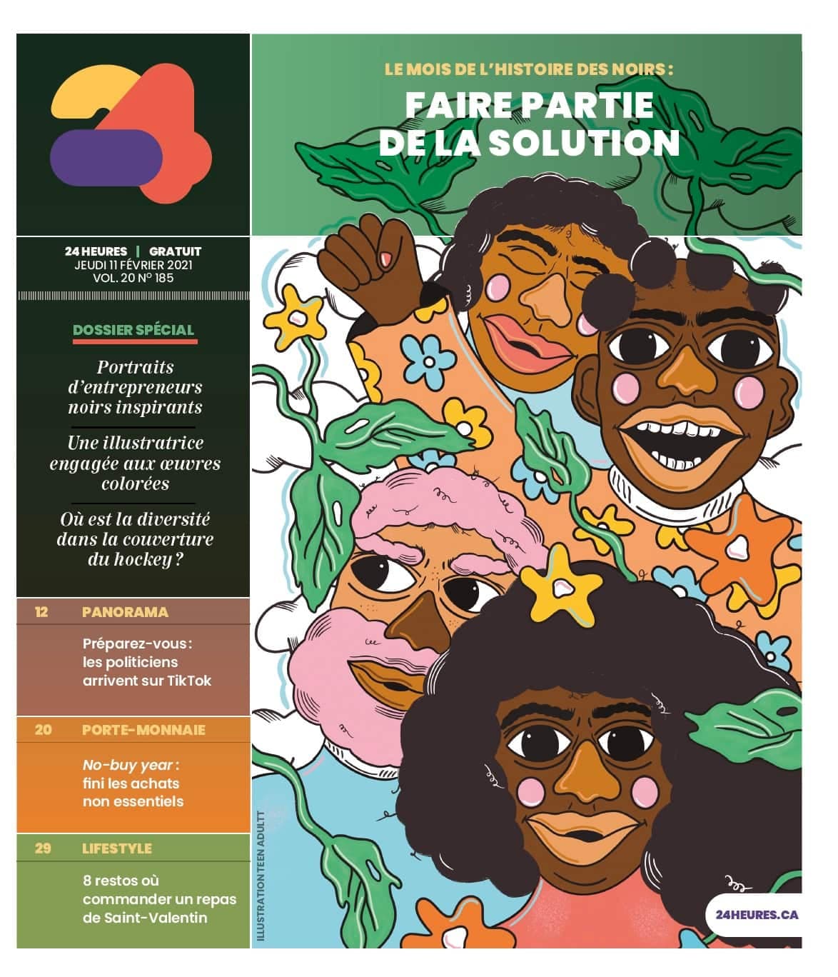 Teenadultt, c’est le surnom Instagram de l’illustratrice montréalaise Kezna Dalz. C’est elle qui signe la page frontispice de cette édition du nouveau 24 heures.
