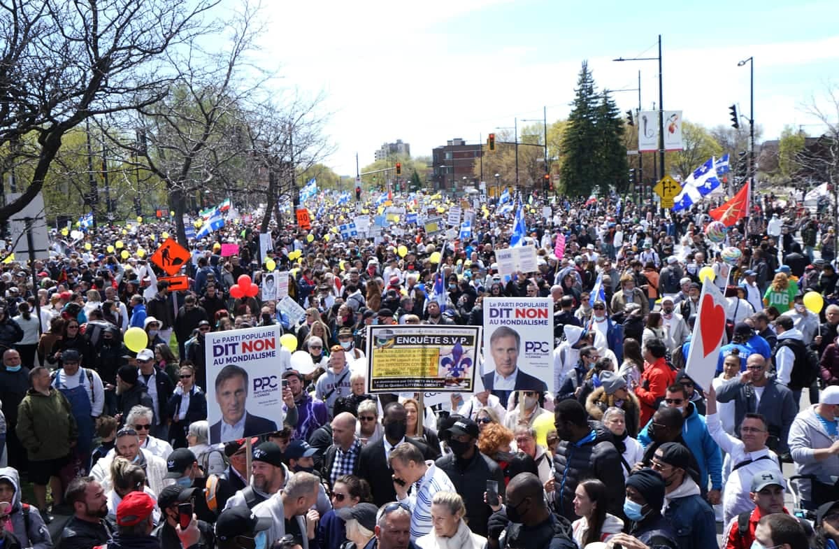Quelques milliers de personnes manifestaient samedi à Montréal contre les mesures sanitaires pour lutter contre la COVID-19. Des manifestations similaires se sont aussi produites ailleurs dans le monde.