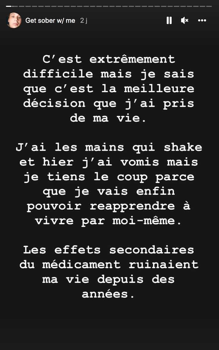 Dans une enfilade de stories, disponibles de manière permanente sur son profil, la première gagnante de La Voix a mentionné vouloir en finir une fois pour toutes avec ses problèmes de dépendance. Consciente qu'il s'agit d'une décision «difficile», de son propre aveu, elle estime toutefois qu'il s'agit de la meilleure décision qu'elle a prise dans sa vie, car les effets secondaires de sa consommation «ruinaient [sa] vie» depuis des années.