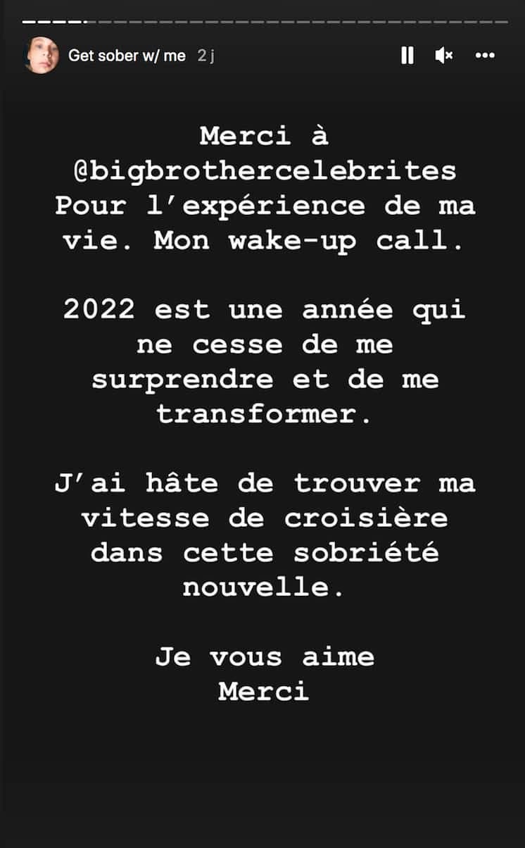 Elle mentionne que c'est son passage à Big Brother Célébrités, au mois de janvier, qui aura été l'élément déclencheur de sa prise de conscience. Rappelons que la jeune femme de 28 ans avait quitté l'aventure de son plein gré après quelques semaines seulement.