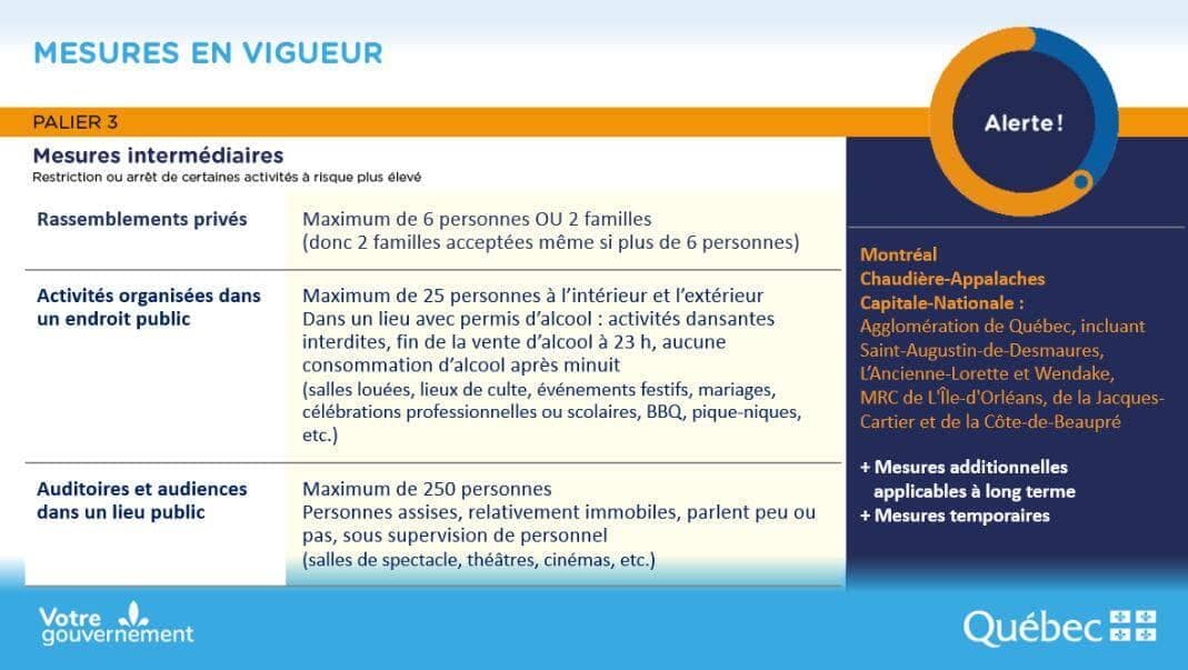 Le gouvernement provincial a resserré les règles sanitaires à Montréal, dans la Capitale-Nationale et en Chaudière-Appalaches hier en les plaçant en zone orange, à cause de l’augmentation des cas de coronavirus.