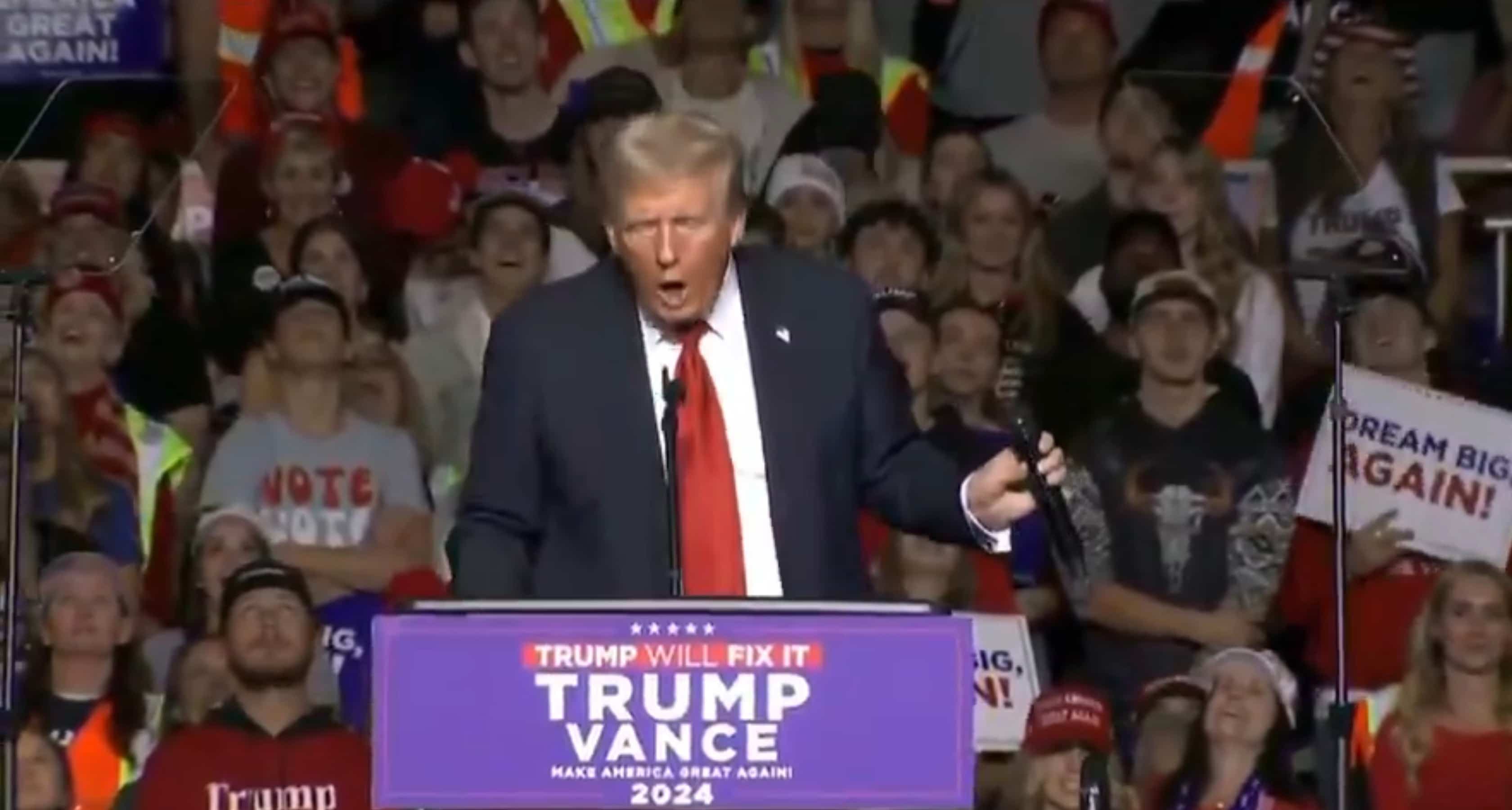 À un certain moment, la foule s’est mise à scander «FIX THE MIC» (réparez le micro), ce à quoi Trump a répondu qu’il allait devoir assommer quelqu’un dans les coulisses.