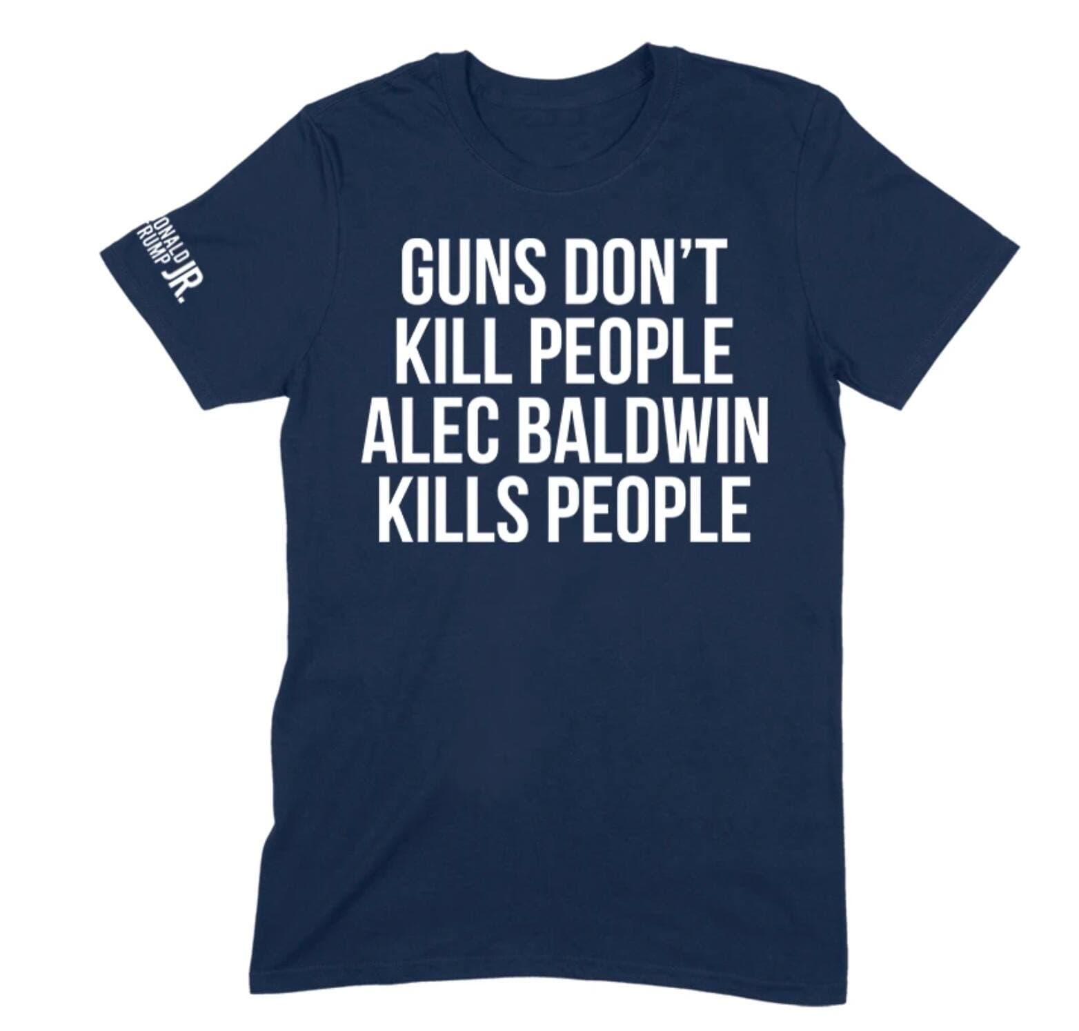Dimanche, l’aîné des enfants de l’ancien président américain a partagé dans sa story Instagram une photo d’un t-shirt sur lequel on peut lire «Guns Don’t Kill People, Alec Baldwin Kills People» (Les armes à feu ne tuent pas les gens, Alec Baldwin tue les gens). Le gaminet de mauvais goût est en vente au prix de 27,99 dollars américain dans la boutique en ligne de Don Jr.