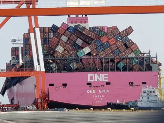 Le vaisseau Apus de la compagnie ONE (Ocean Network Express) a perdu très exactement 1816 conteneurs au fond de l’océan avant de récemment arriver au port de Kobe, au Japon.