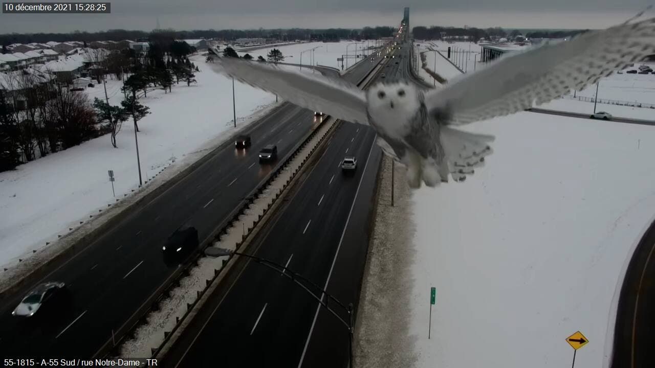 Un harfang des neiges joue à la vedette devant les caméras de Transport Québec!