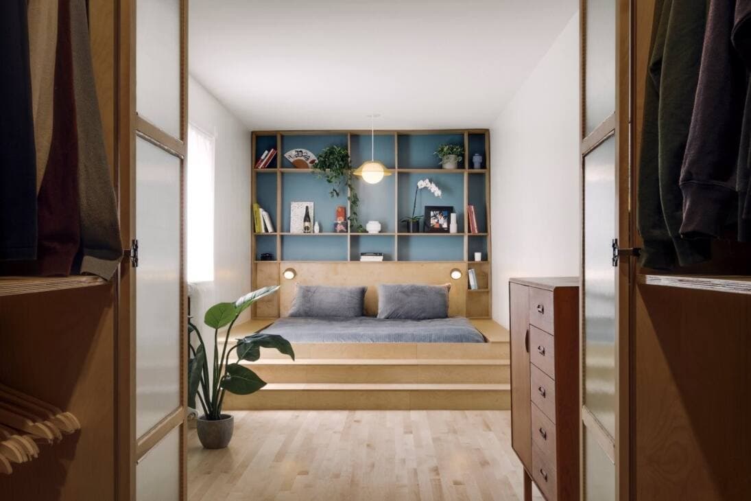 La chambre principale a droit à un lit des plus uniques, avec une étagère pour tête.