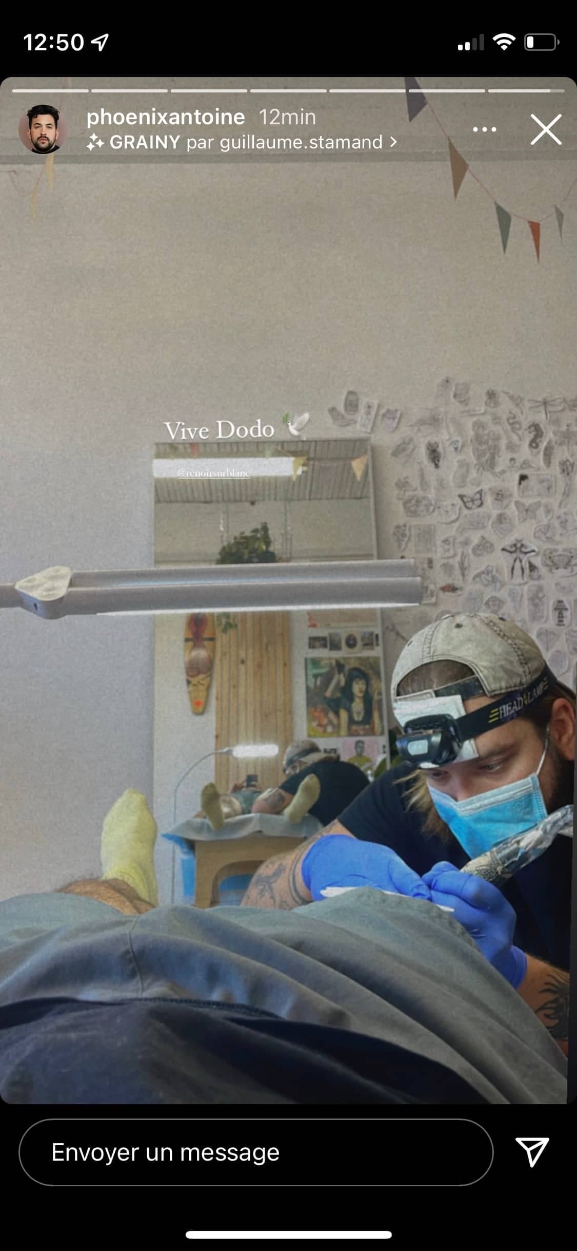 Il a d'abord partagé une photo où on le voit, pendant la session, allongé sur la station du tatoueur, nous permettant de voir que l'œuvre se trouvera sur sa cuisse droite.