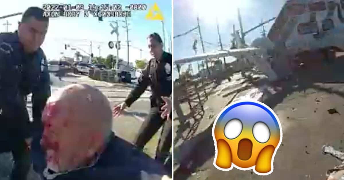On y voit une homme dont le visage et les vêtements sont maculés de sang être extirpé d’un petit avion par quelques policiers littéralement 6 secondes avant qu’un train n’entre en collision violente avec le Cessna 172.